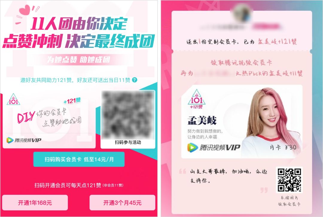 同样吃相难看的还有去年腾讯视频的《创造101》,普通用户每天能投 1 票 pick 爱豆,而腾讯会员每天有 11 票。官方会引导粉丝购买多份“定制会员卡”,粉丝买一张定制卡可以直接给爱豆增加 121 张票,平台还鼓励粉丝以“送会员卡”为噱头拉票。