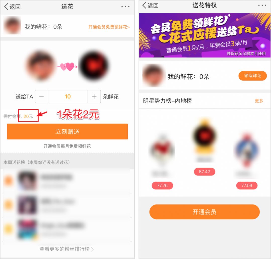 首当其冲的就是微博的明星势力榜,榜单的“爱慕值”维度,需要粉丝 2 元 1 朵花真金白银刷出来,即使冲了会员,普通会员不过 1 朵/月,年费会员 3 朵/月。