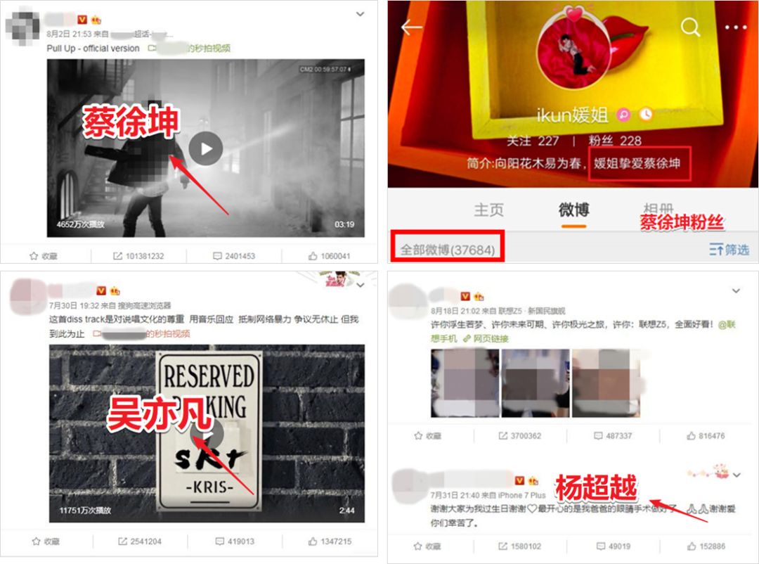 虽然共青团中央没有明确指出这些明星都是谁(没有直接点名,并且文章里的截图都被打码了)但是我们还是可以从图片中的微博内容推断出,这些明星包括蔡徐坤、吴亦凡以及杨超越等……
