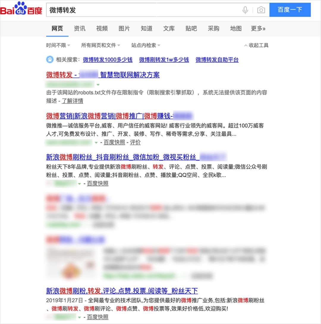 百度随手一搜“微博转发”,就会出现一堆刷量的平台。