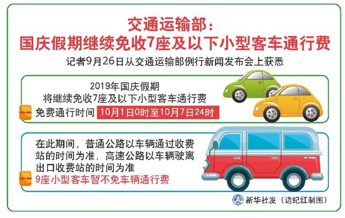 记者26日从交通运输部例行新闻发布会上获悉,今年国庆假期,将继续免收7座及以下小型客车通行费,免费通行时间为10月1日0时至10月7日24时,在此期间,普通公路以车辆通过收费站的时间为准,高速公路以车辆驶离出口收费站的时间为准。9座小型客车暂不免车辆通行费。