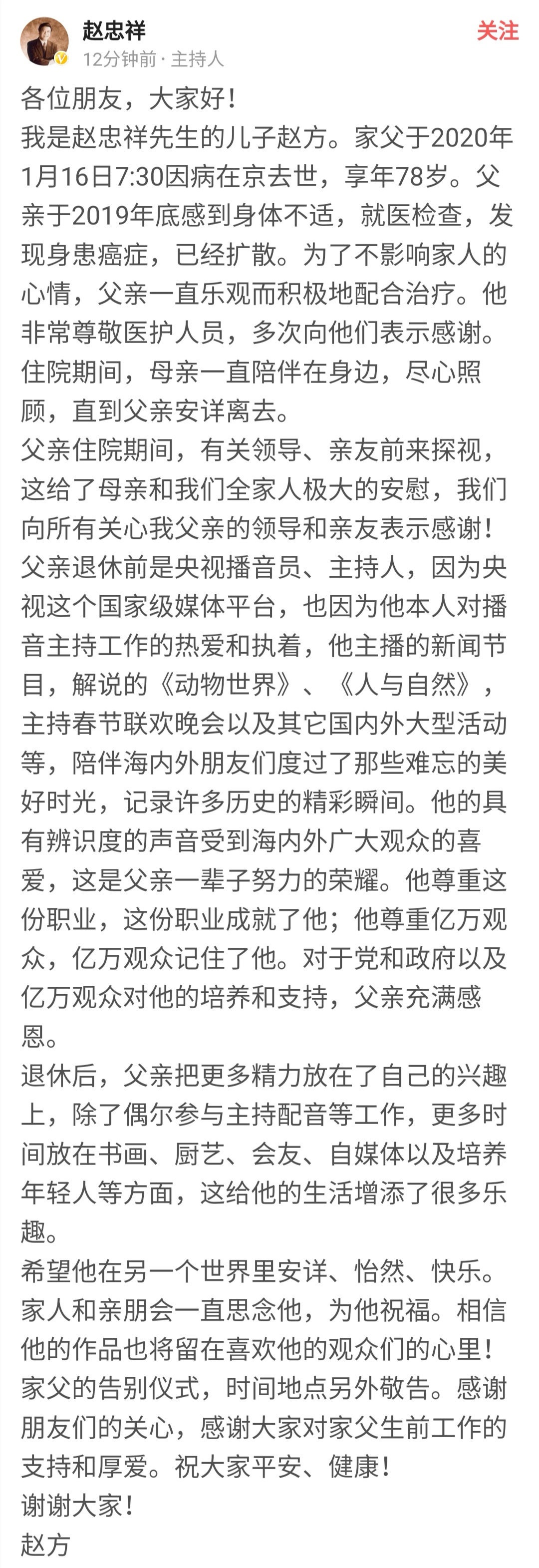 赵忠祥之子赵方证实,赵忠祥今日因癌症在京去世,享年78岁。