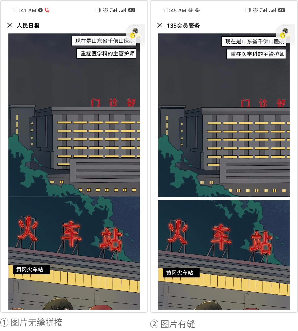 看看下面这个例子,左边的是人民日报公众号,于3月17日发表的文章《“没事,有我在!”》,文章是用条漫的形式来表现的。在微信公众平台上传时,默认会出现白色缝隙,使得文章看起来“断断续续”的。