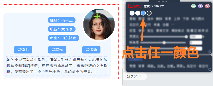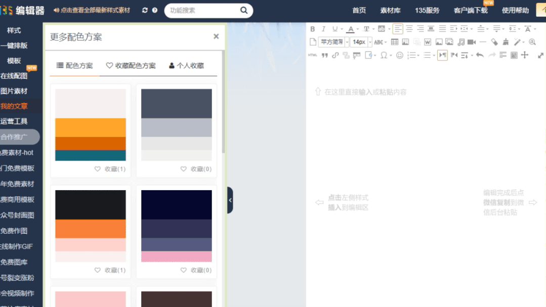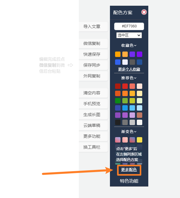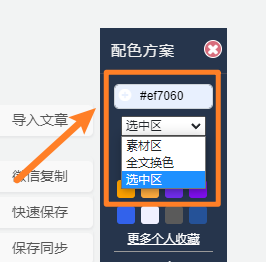 复制这些颜色下方的参数,粘贴到135编辑器的『配色方案』中,就可以对你文章的选中区域、素材区或全文进行一键换色。