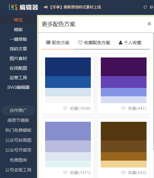 除了三儿给大家推荐的这些莫兰迪配色方案,135编辑器还准备了几百套配色方案,全部聚合在『配色方案』中,无论你是什么行业,什么风格的文章,都可以找到一款适合的,又好看又实用!