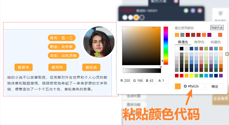 将鼠标移动到颜色上,颜色代码自动浮现,点击代码,即可成功复制颜色代码;