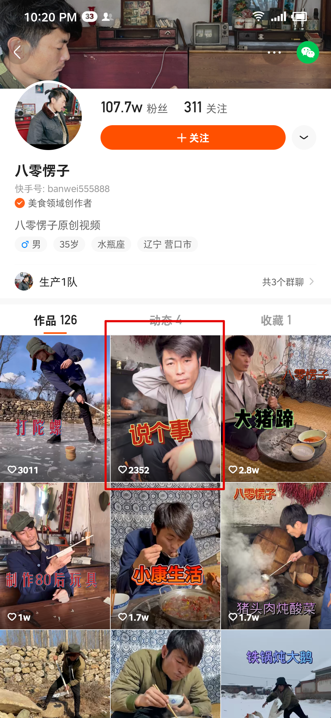在抖音,粉丝是因为你的内容而来,当内容数据不行的时候,抖音就不会把内容推荐给其他人,连粉丝都不会被全部推荐。做广告就要考虑到播放量暴跌的可能,考虑到很多粉丝不买账。【八零愣子】平常的作品在快手上播放量100万左右,然而做了一条广告播放量16万。假设到广告播出时这条视频还有20%的人在看,那就只有3万人看了广告,假设千分之一的转化率,那就只转化了30人,这是个二手回收软件下载。假设获客成本200元,那这条广告也就值6000元。从个人的角度看,也算高了。但是从商业化的角度看,这种账号价值不大。