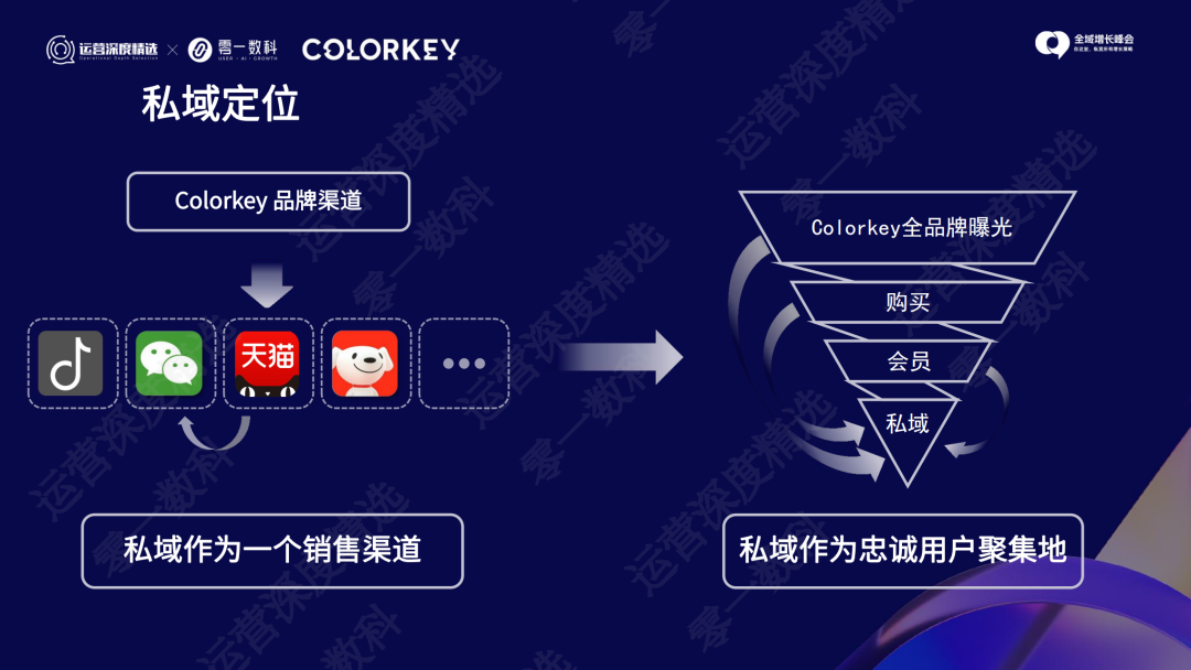 为什么说私域需要绑定会员?因为从整个营销链路来看,通过珂拉琪的品牌曝光,然后再去转会员,整个链路相对来说比较短,而且比较有效,去年9月国家对数据加密了之后,我们触达的消费者其实就只有会员了;第二个是从品牌购买的转化来说,会员的溢价比其它要高。