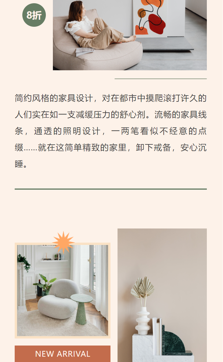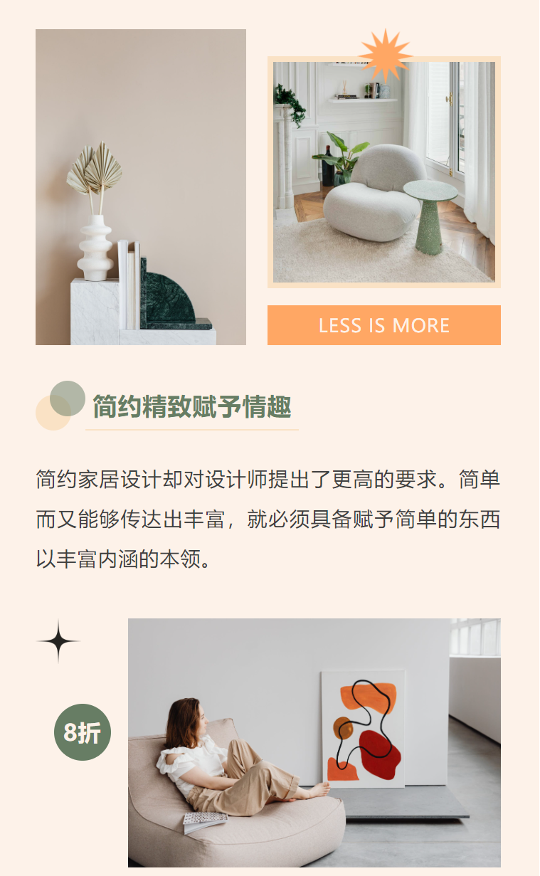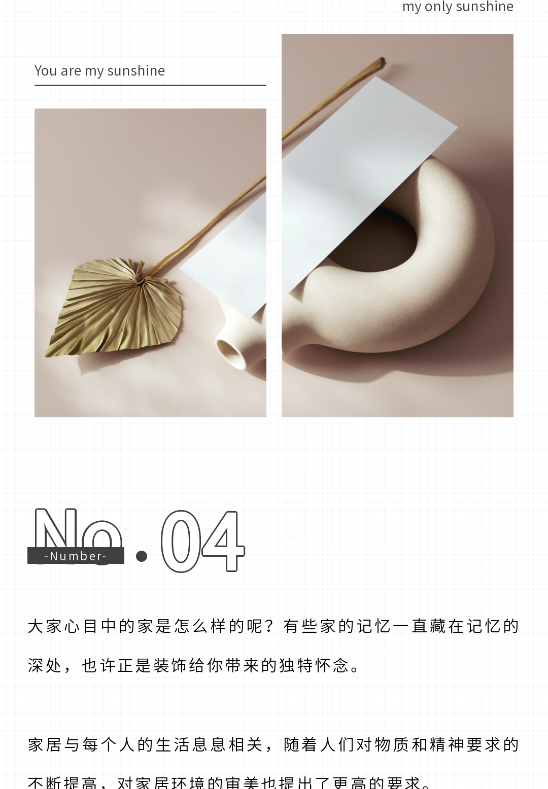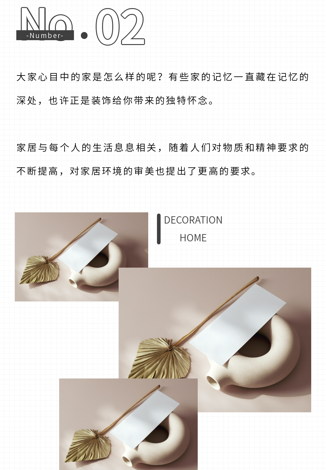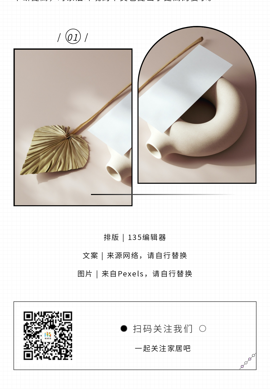 这类推文排版的发挥空间大,主要是与推荐家居单品、家居搭配等方面有关,推文排版的整体氛围很重要,图片占比较大,排版的发挥空间大,风格上可以选择ins风、莫兰迪色、极简风。
