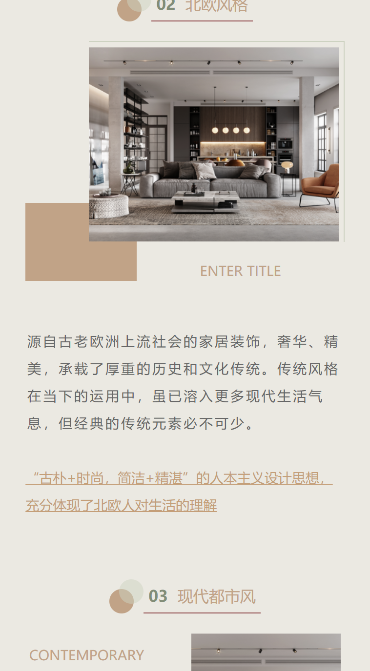 装修公司、房地产开发商等会涉及到房屋装修的介绍,主要围绕房屋装修的风格、样板间展示,排版上要注意多使用图片来展示,氛围的打造,吸引客户阅读,模板的选择上可以考虑高级风、清新风、ins风等。