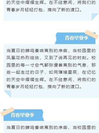 - 样式ID:159912 的毕业季底色内容简约清新蓝色样式,为正文增添了清新的感觉。适用于毕业季推文的正文内容排版,搭配校园回忆、成长感悟等内容,能让读者感受到青春的美好。在 135 编辑器中搜索样式ID即可使用。