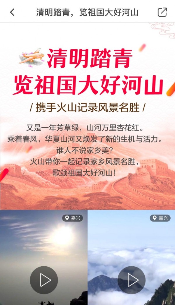据悉,火山小视频还制作了祖国自然风光的宣传页:“清明踏青,览祖国大好河山”,将平台上记录家乡、山河风光的视频搜集整理,集中呈现。