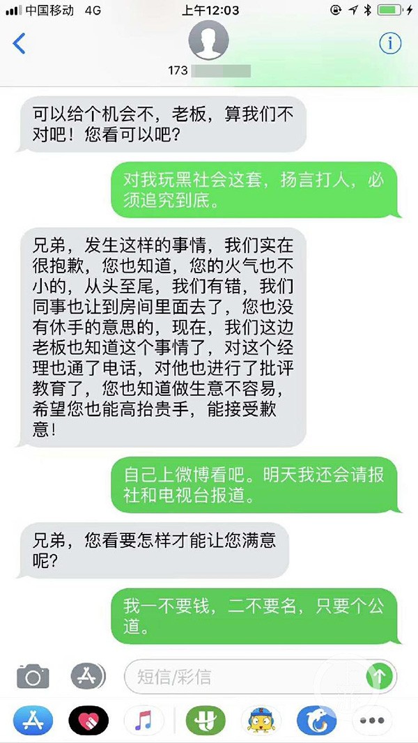 涉事酒店方面随后通过短信向于建嵘表达歉意,称已经教育批评了当事人,希望能够高抬贵手。
