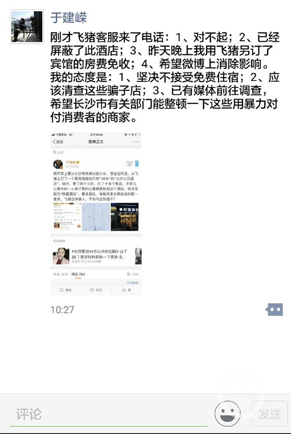 知名学者于建嵘4月7日通过飞猪网络平台预订一家长沙的酒店,而该酒店在飞猪上的标注距离和实际位置存在明显的差异。当晚,于建嵘好不容易找到酒店之后,发现酒店的名称也不一样,随即要求退时却遭到对方“推人,亮拳头”暴力威胁,于是在微博上曝光此事。