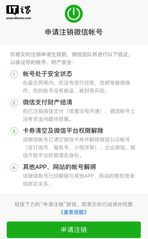 有IT之家网友爆料称,在微信App的微信安全中心当中上线了申请注销微信账号功能,用户在解决微信注销的所有条件之后就可以申请注销,这也意味着该账号将永远消失。
