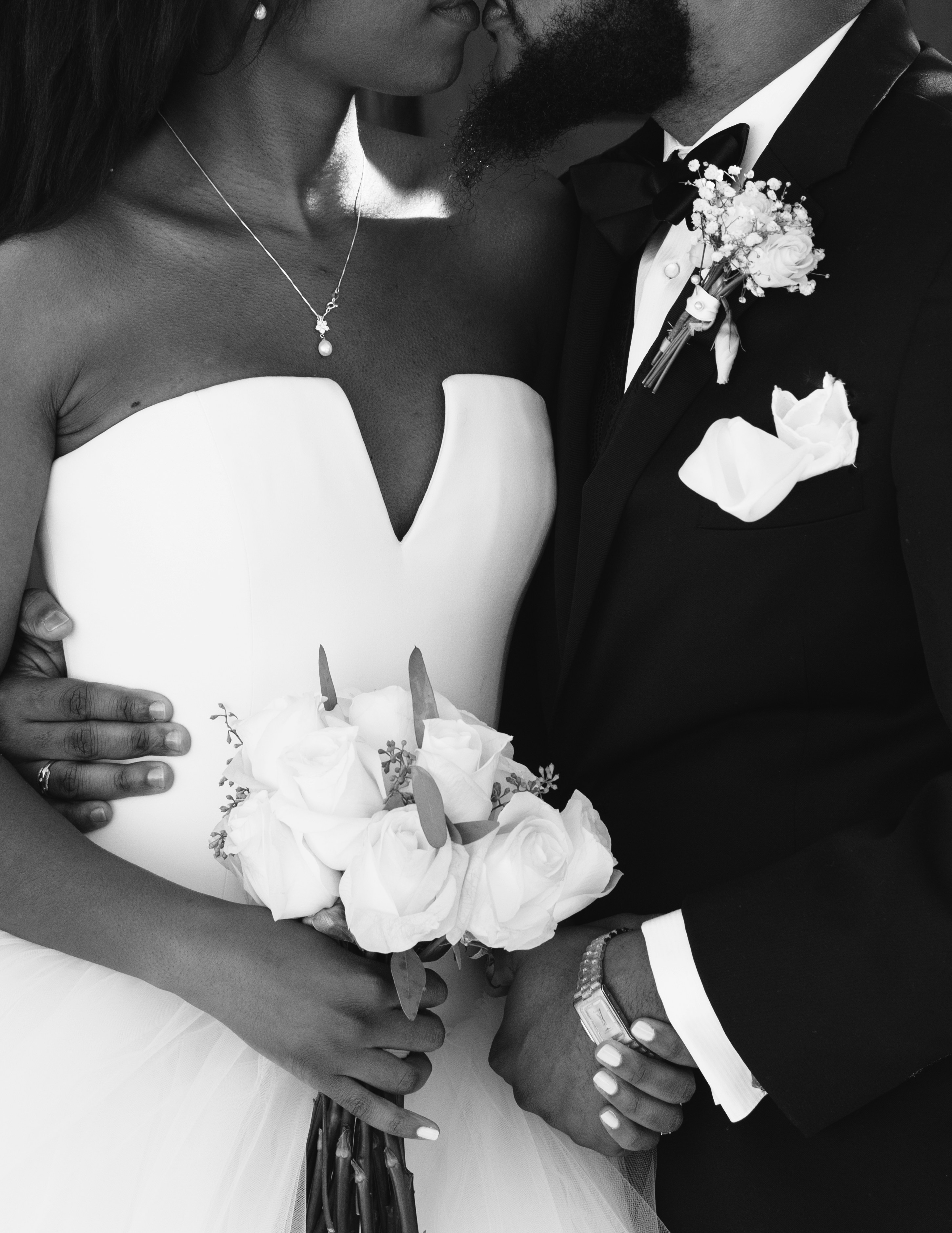 man,male,woman,female,couple,black and white,bride,groom,tree,bush,woodland,forest,bouquet,flowers,veil,suit,seat,bench,kissing,whitedress