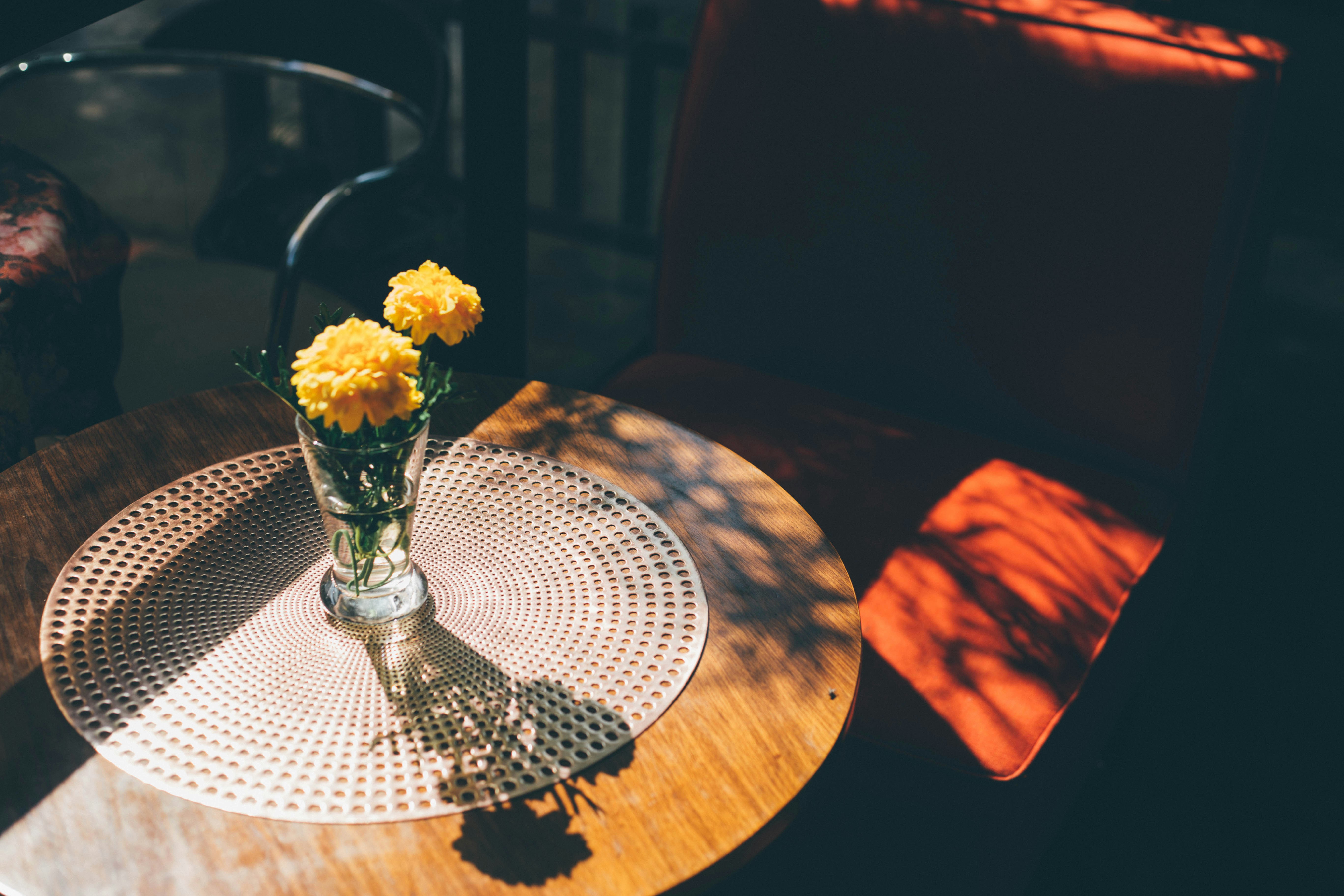 桌子,鲜花,花瓶,玻璃,黄色,水,阳光,阴影,图案,室内,光线,早晨