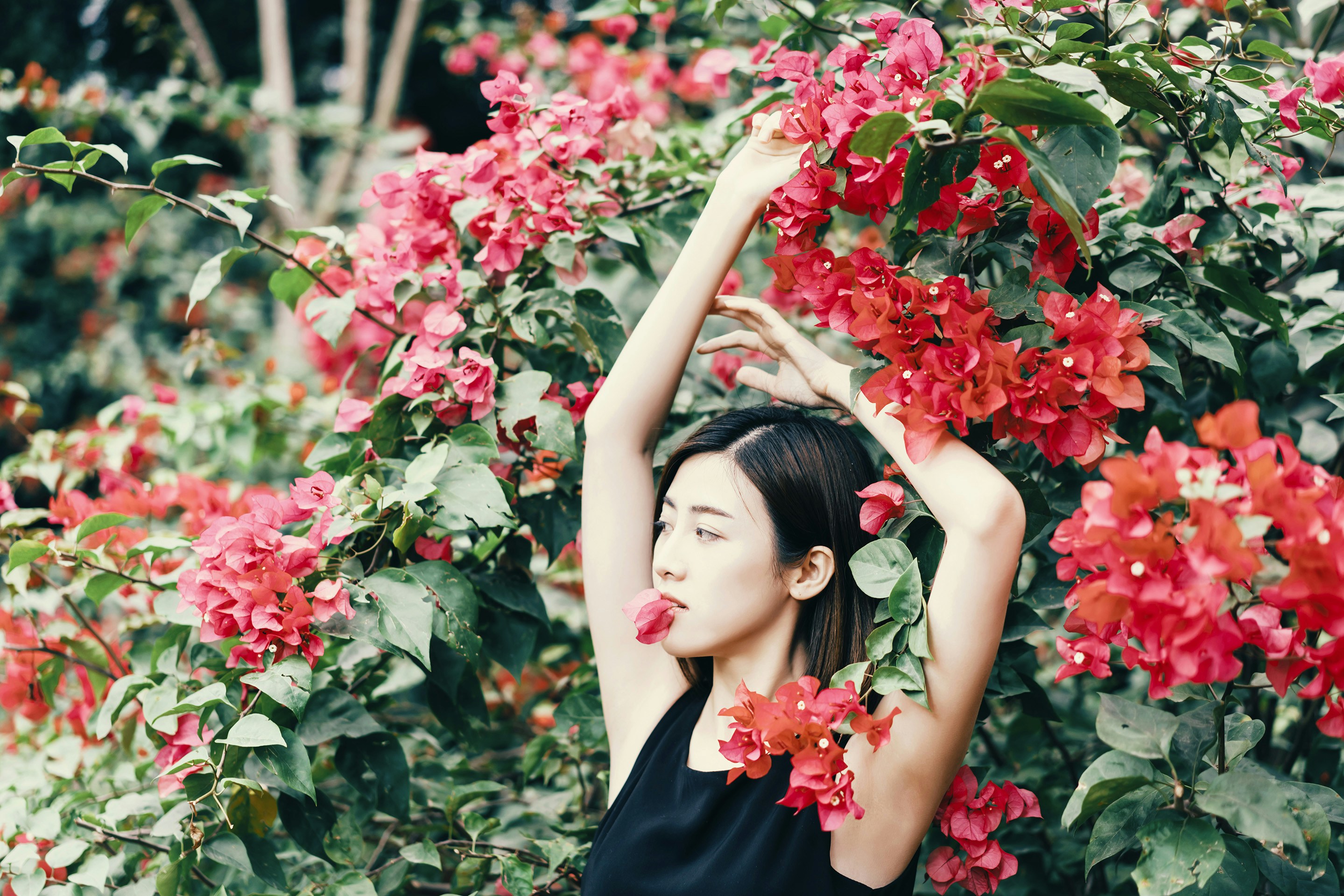花卉,花卉,花园,布什,植物,红色,女性,女性,肖像,模特,女孩,亚洲人