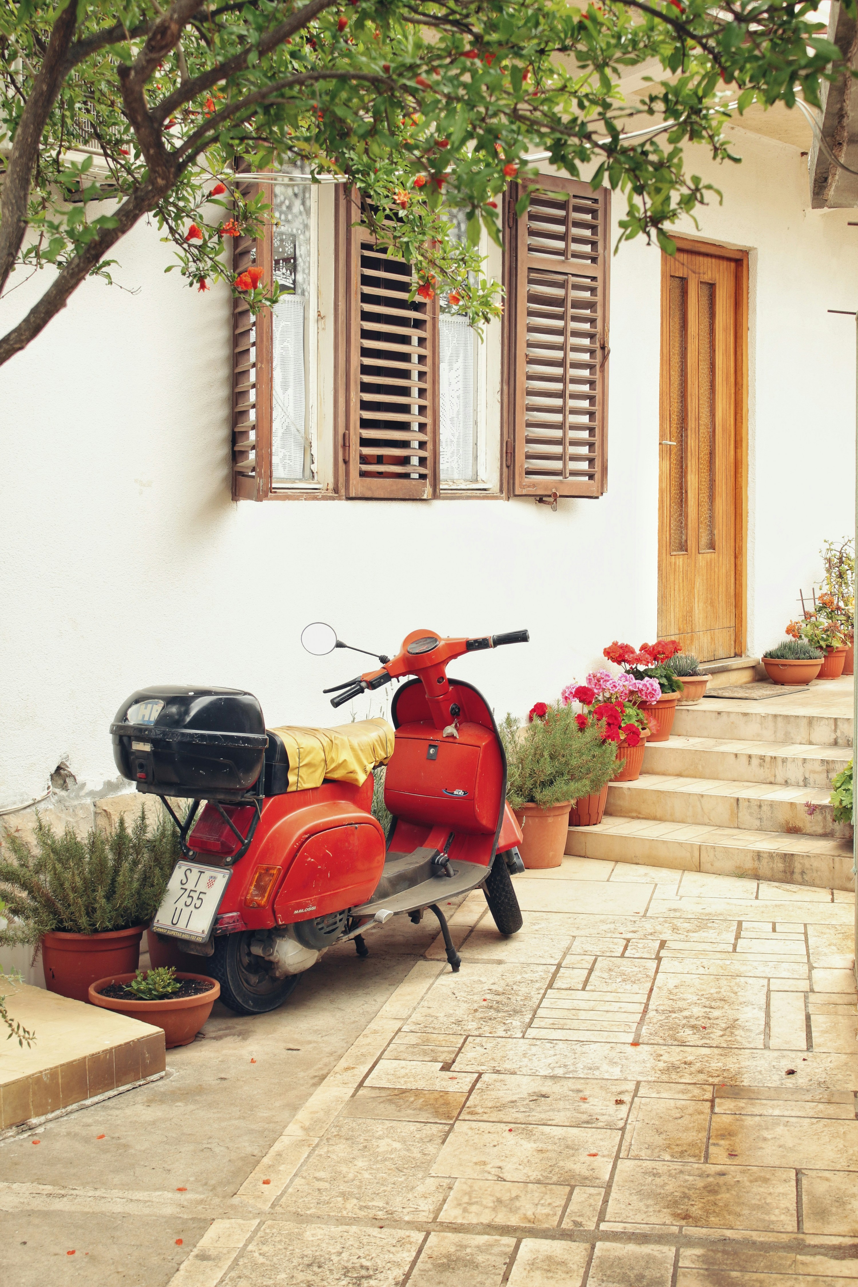 轻便摩托车,帆布,门,门道,窗户,百叶窗,植物,树,花,花,花园,台阶,铺路,花盆,花盆,花盆,花盆,花盆,花盆,红色,车辆,交通,房子