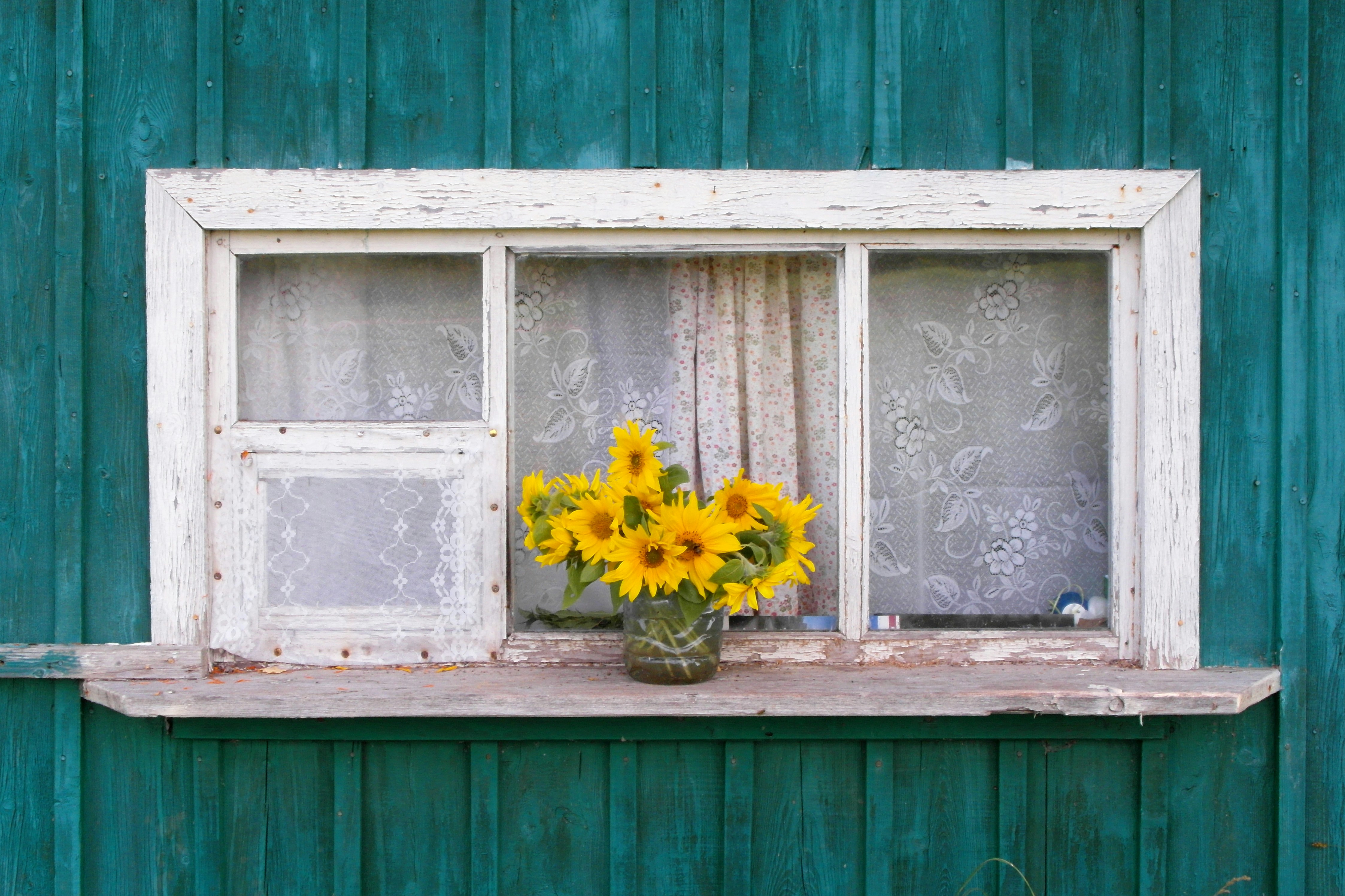 窗,老,花,黄,向日葵,夏天,绿色,墙壁,木制,窗帘,网,框架,白色,画