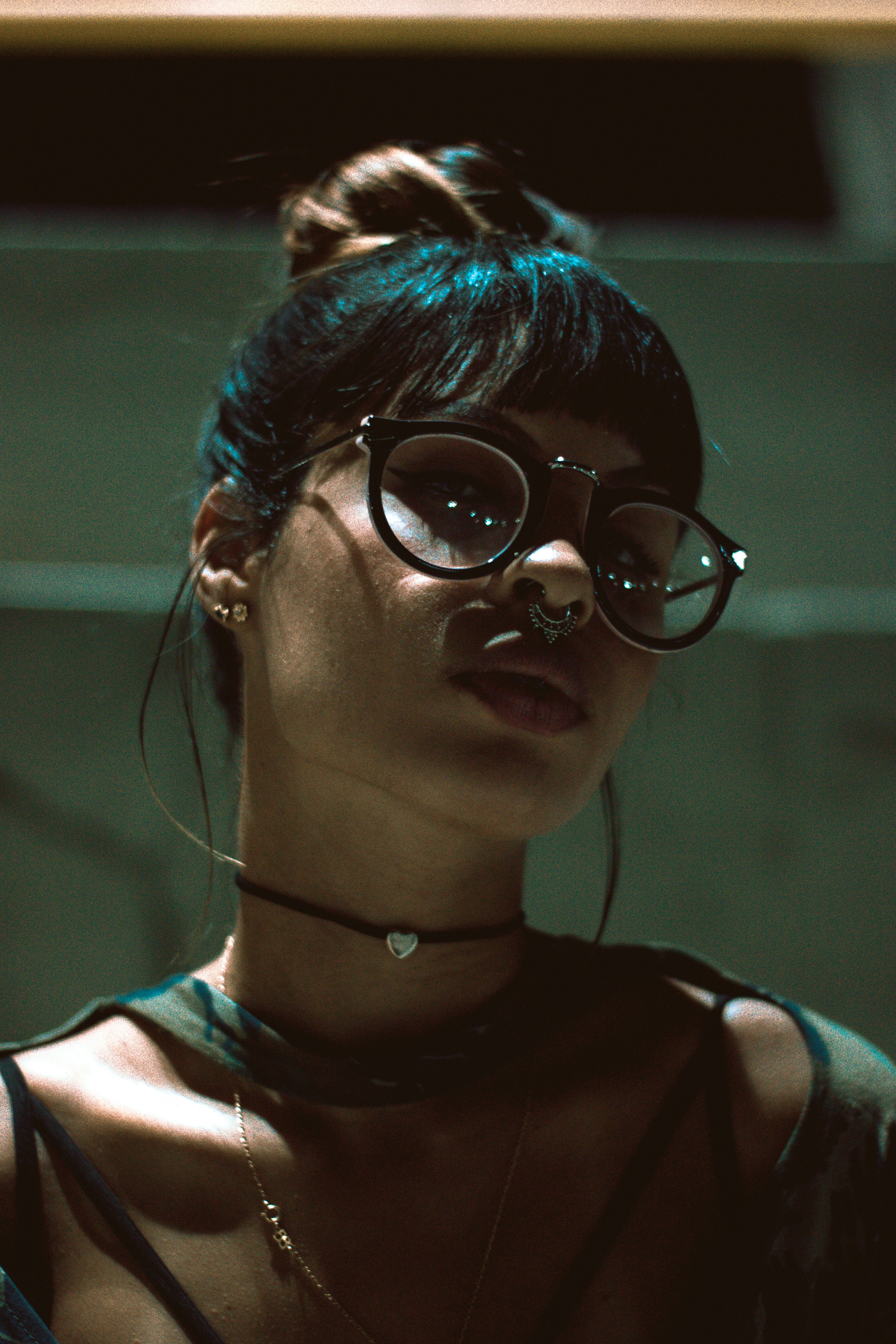 女人,女人,刺穿,眼镜,头发,项链,颈圈,反光,嘴唇,女孩,喜怒无常,肖像画,夜景,色调,复调,玻璃,态度,肖像,脸,街