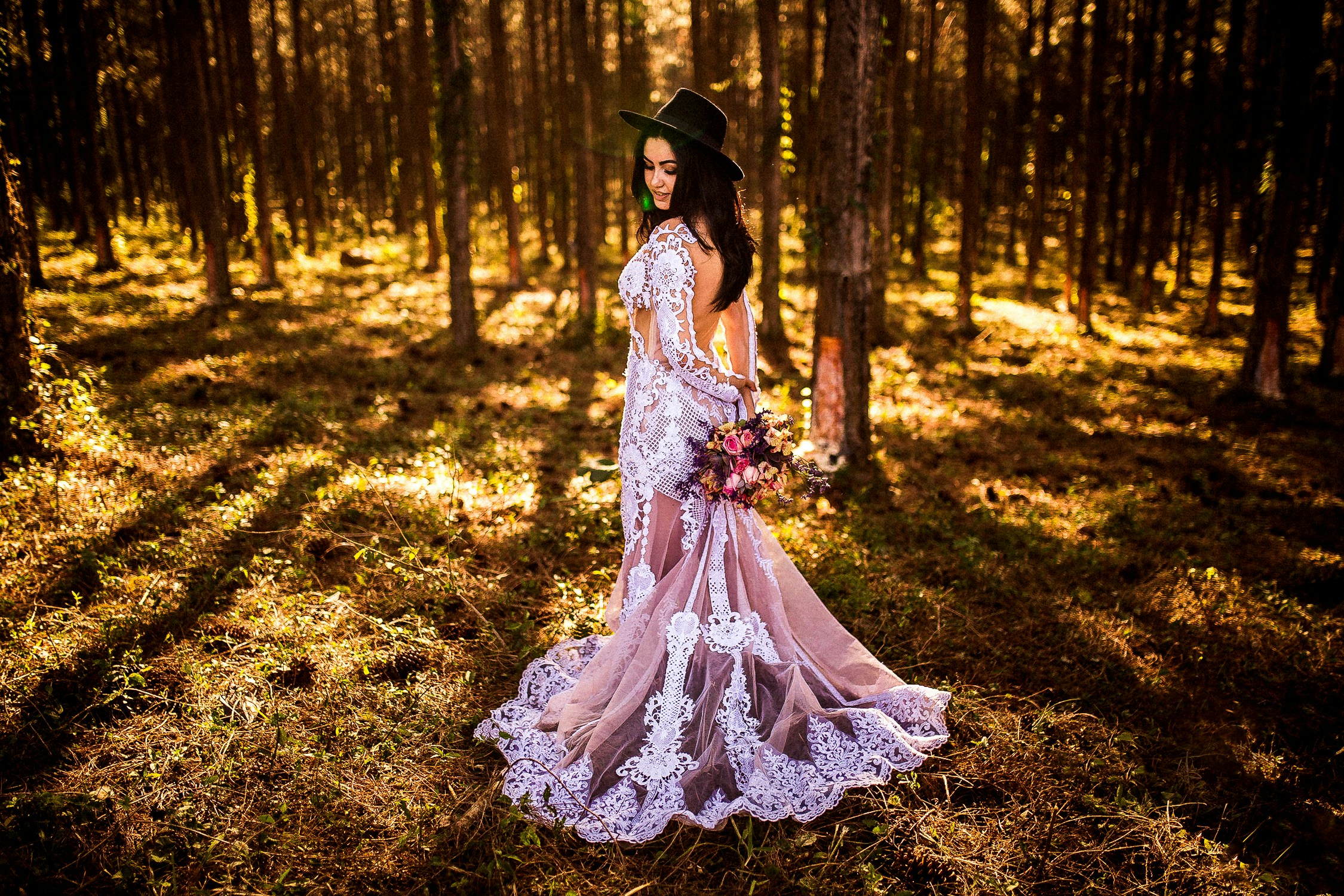 女人,女人,婚礼,鲜花,花束,林地,森林,树,帽子,婚纱照,结婚礼服