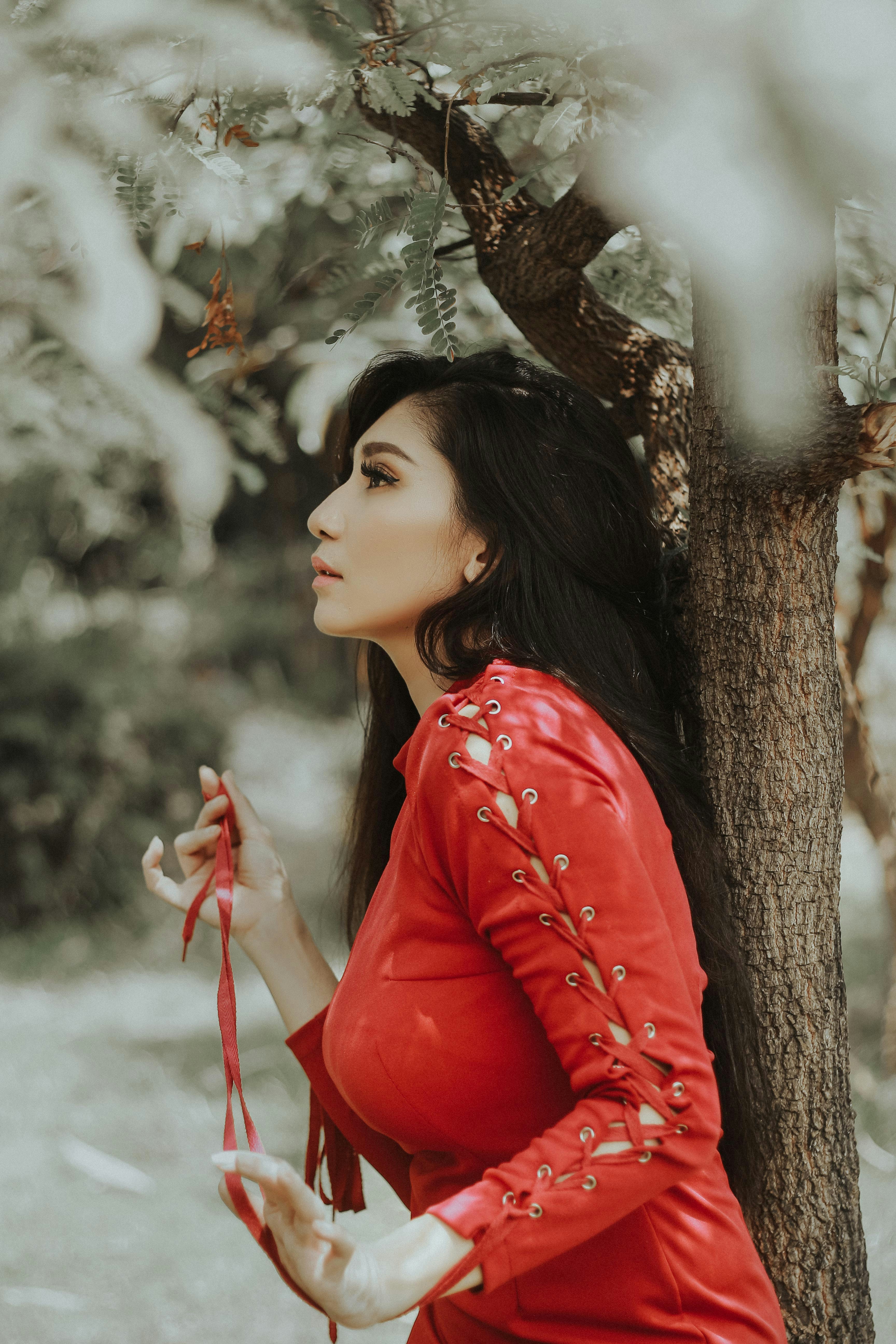 女人,女人,红色,画像,树,林地,森林,模型,时尚,美丽,焦点,民俗,心情,喜怒无常,印度尼西亚,生活,人类,趋势,新的,秋天