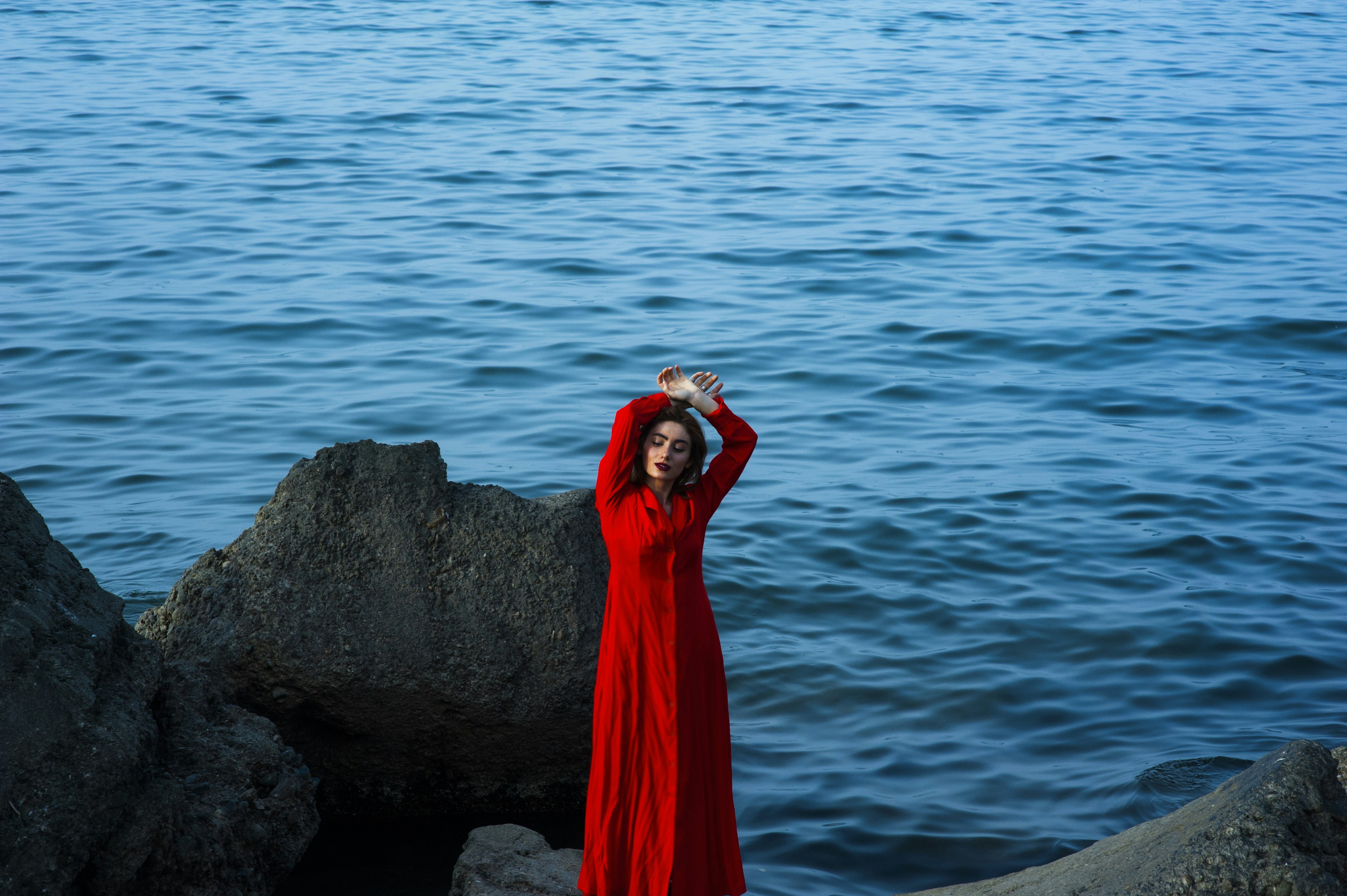 肖像,女人,岩石,石头,大海,湖泊,蓝色,水,红色