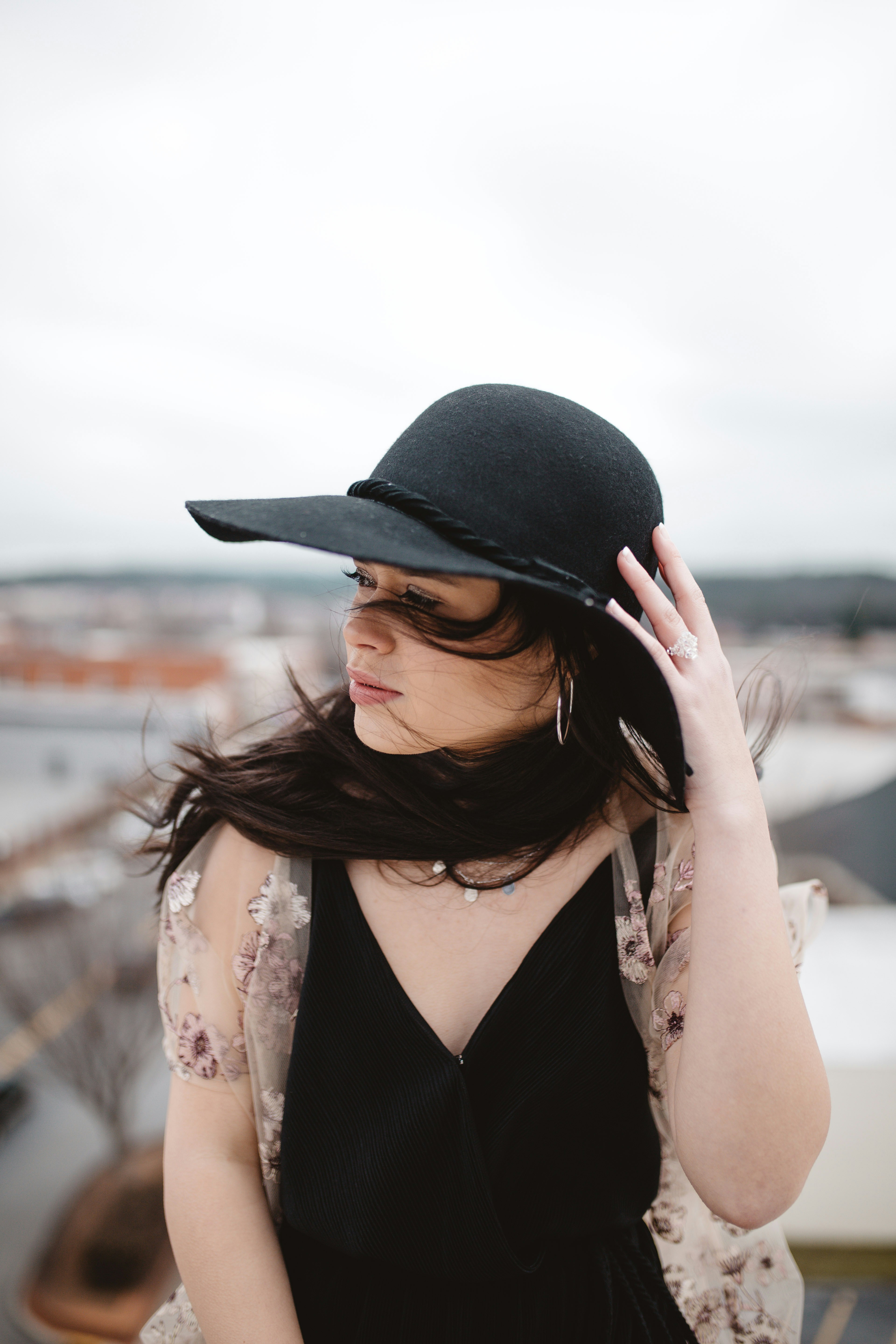 帽子,女人,女人,画像,模特,风,黑,手,城市,屋顶,风
