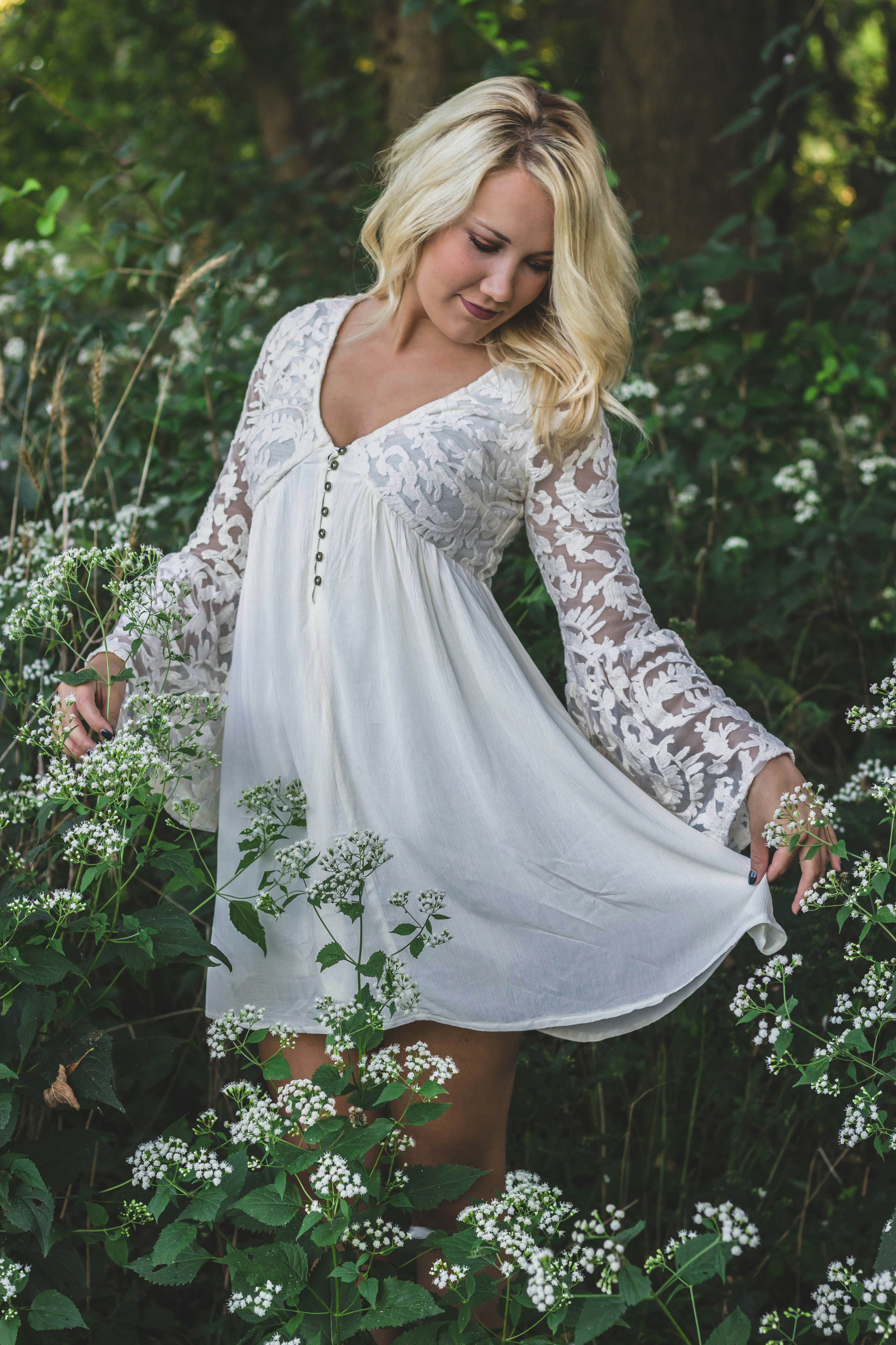女人、肖像、白种人、金发碧眼、白色、绿色、花朵、森林、树木、朴素、优雅、自然