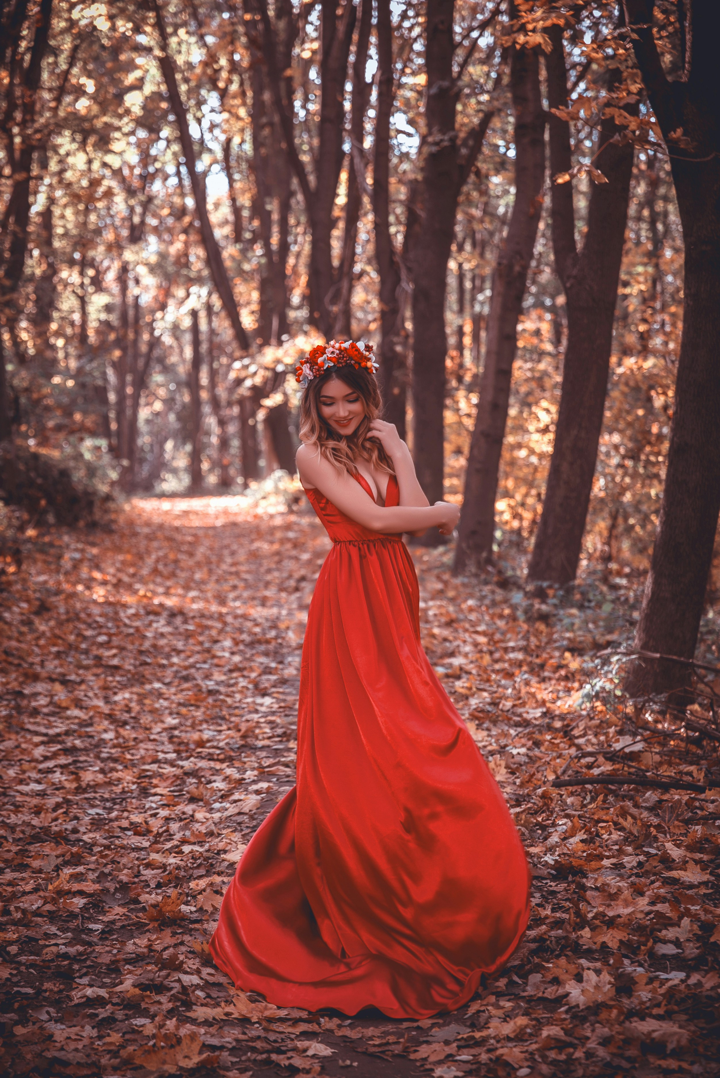 女人,森林,画像,女人,白种人,红色,花朵,秋天,秋天,美丽,乡村,浪漫,可爱,金发,红衣,长裙,树