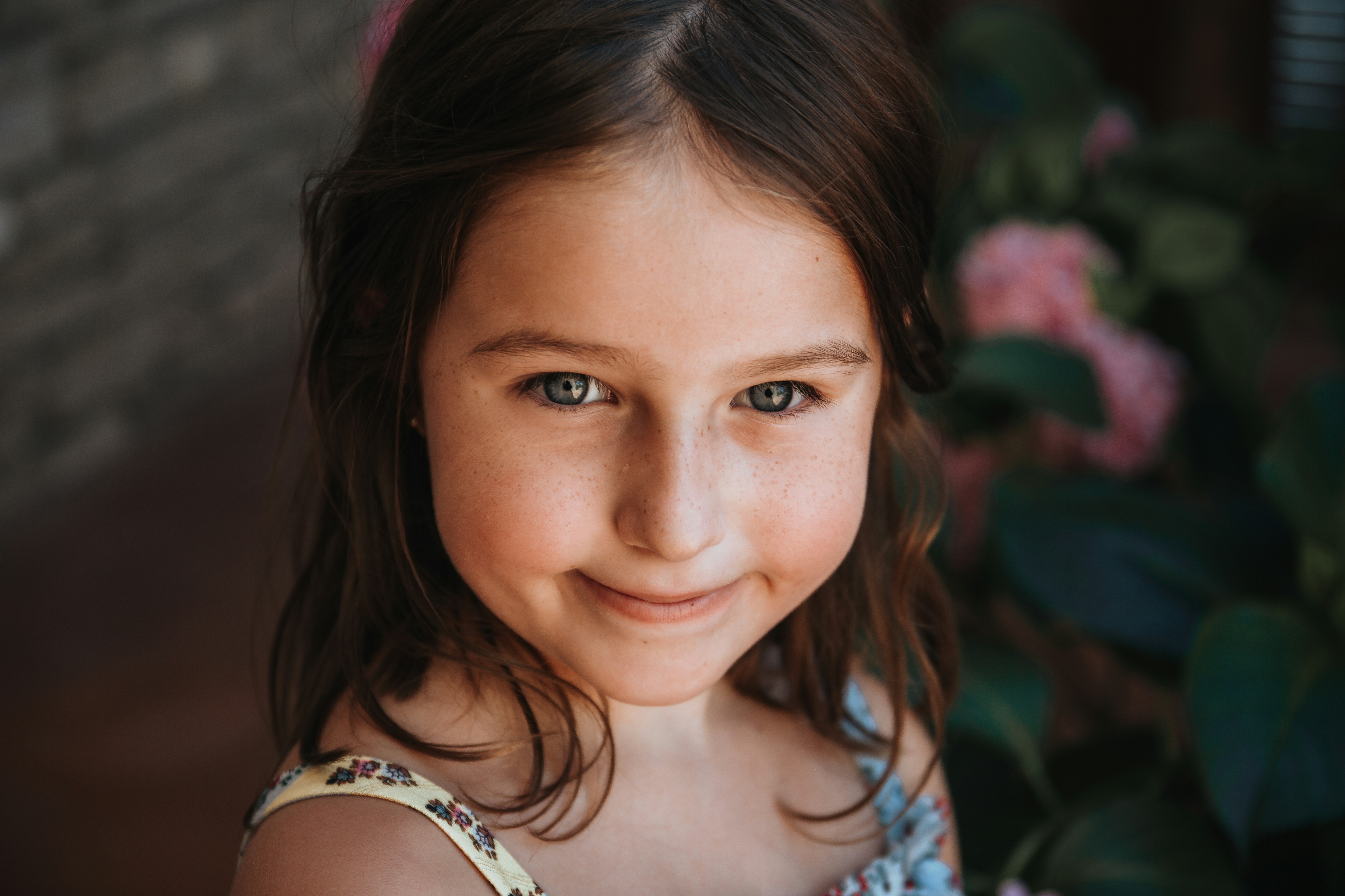 女孩,女性,脸,高加索人,微笑,鲜花,黑头发,美丽,人类,人,雀斑,纯洁,天真,近距离拍摄,刺眼,蓝眼,眼睛,孩子,小孩,肖像
