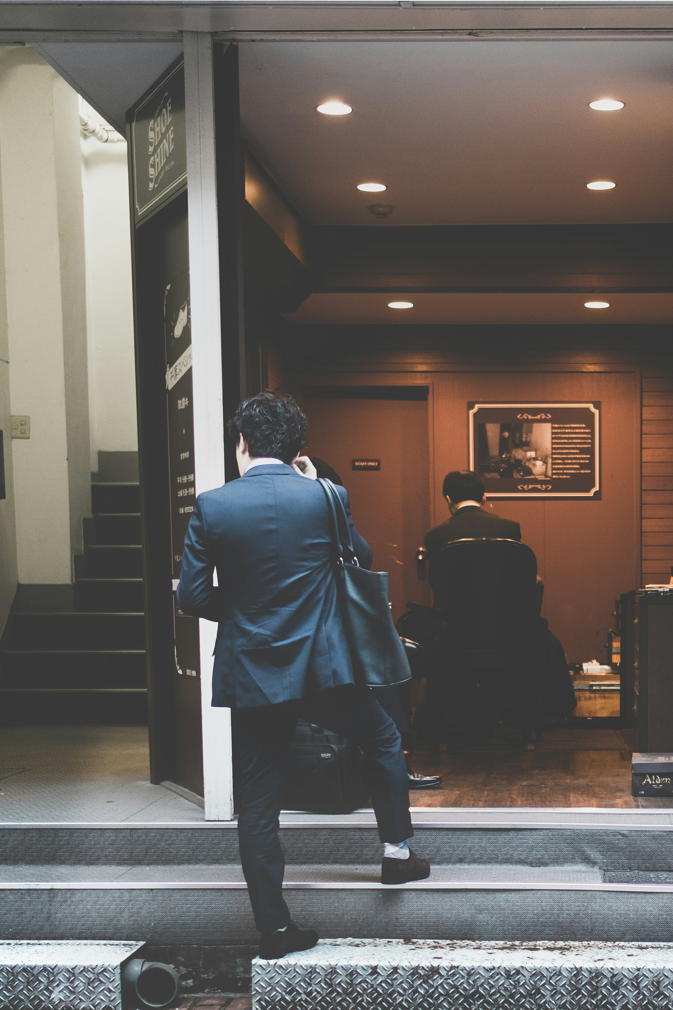 建筑,门口,男人,男人,灯光,台阶,商店,街道,棕色,蓝色,袋子,东京,鞋子闪耀