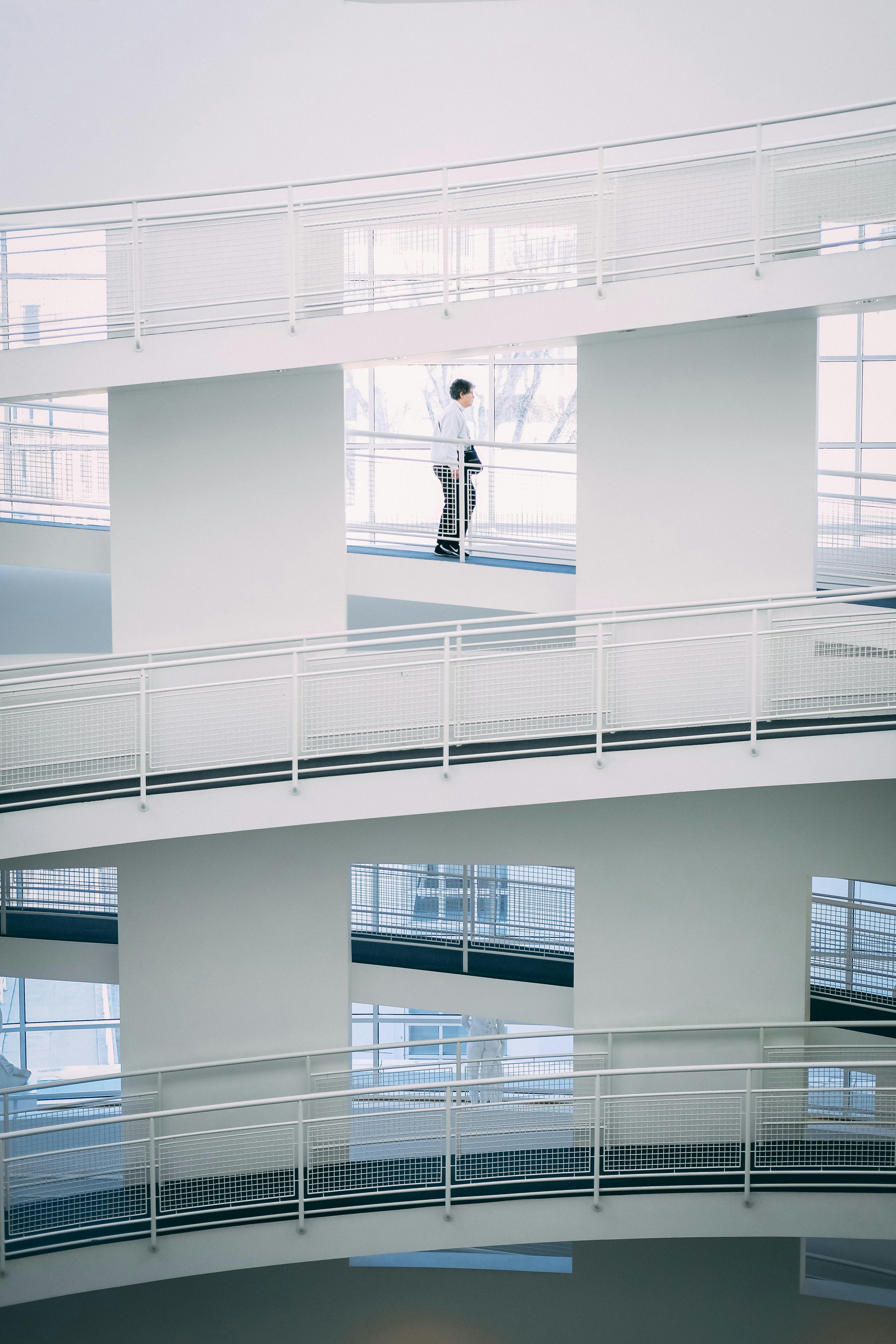 白色,建筑,建筑,栅栏,窗户,男人,男人,台阶,楼梯,扶手,楼梯,通道,步行