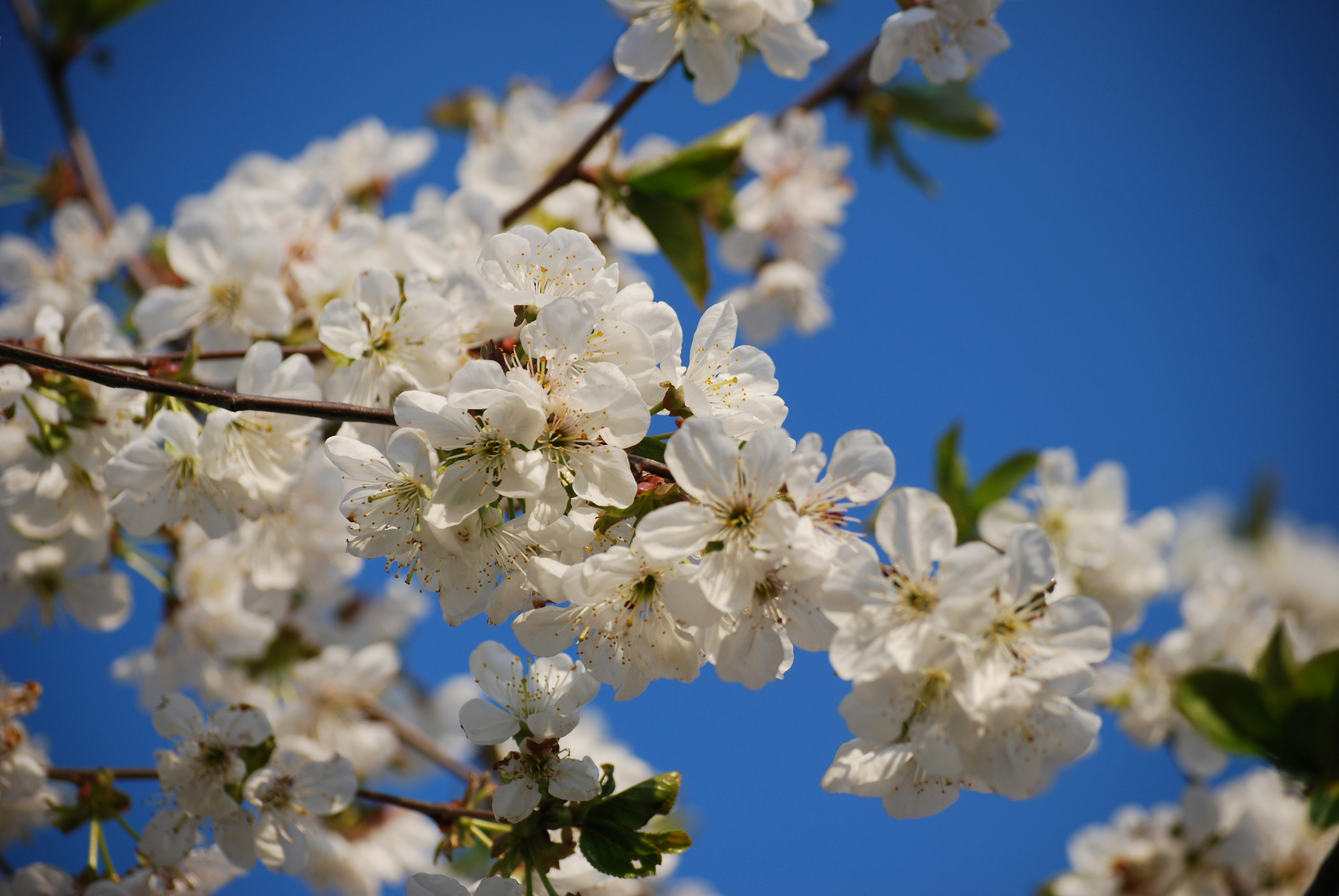 春天的白花枝叶迎着灿烂湛蓝的天空