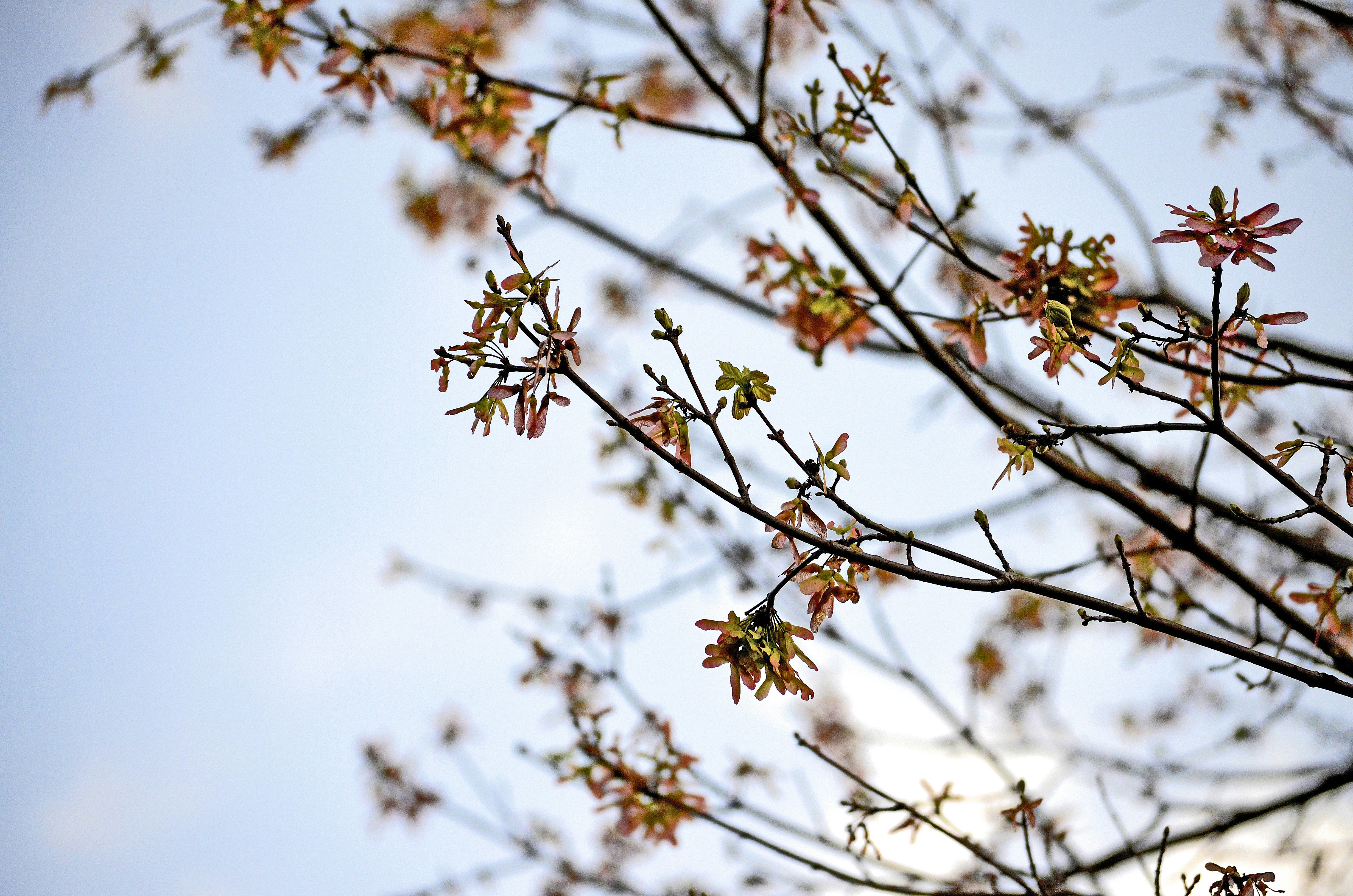 树、枝、叶、芽、模糊、天空、生长、仰望、蓝天、背景、叶子、特写镜头、白天、户外、大自然