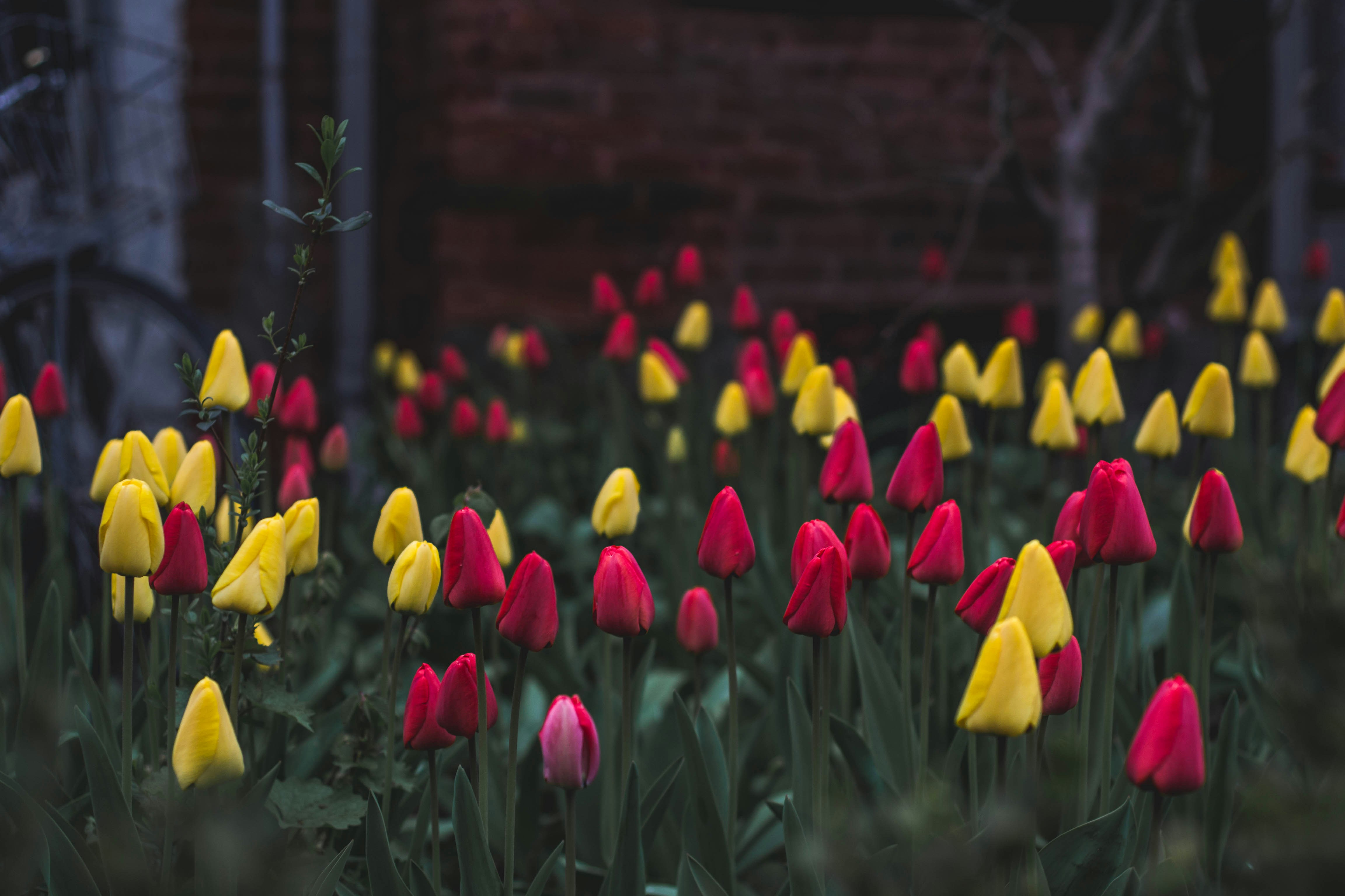 黄红色的郁金香在春天的红砖墙前盛开,哈伯德村