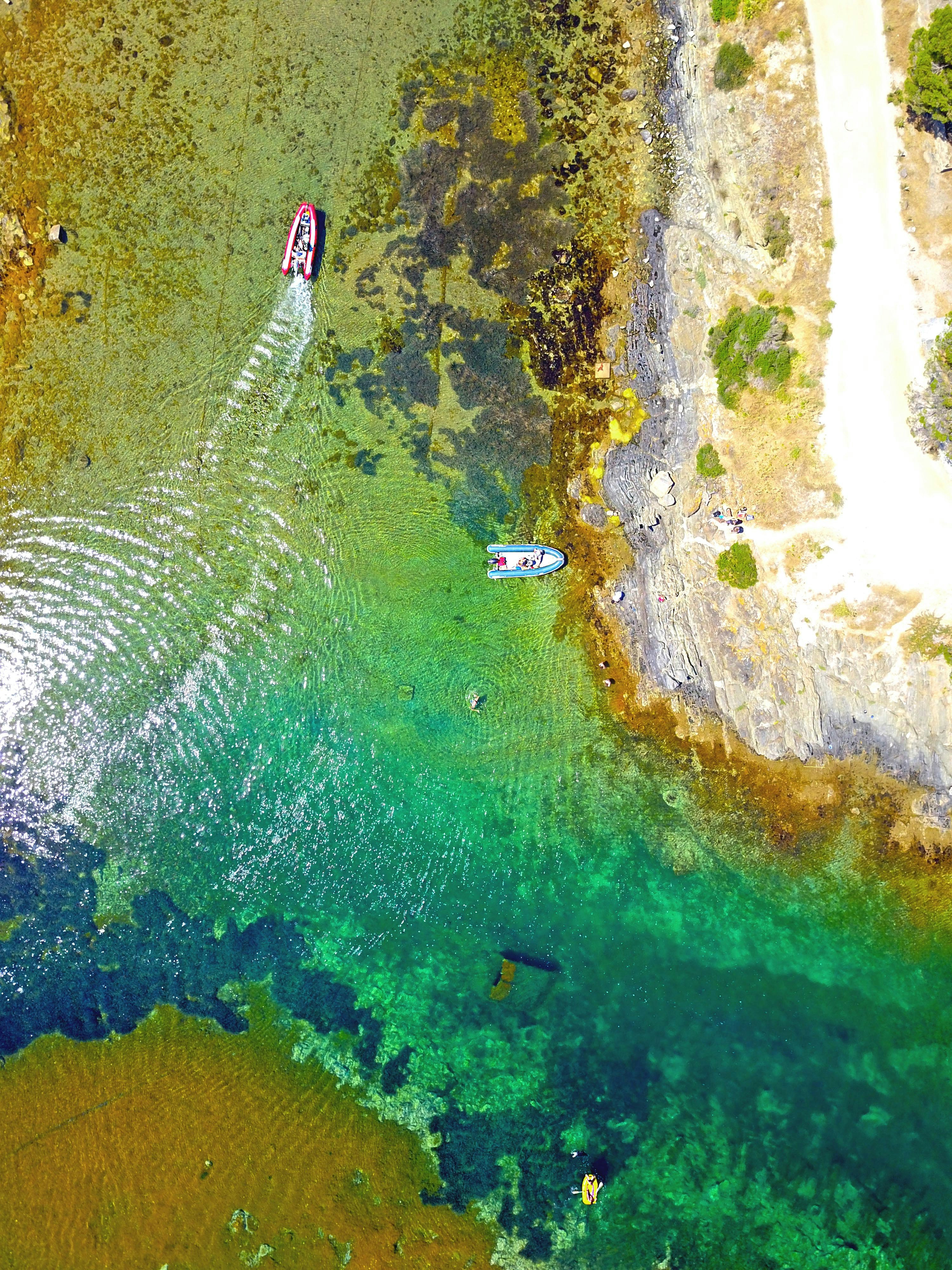 西班牙加泰罗尼亚彩色浅水区船只的无人机观测
