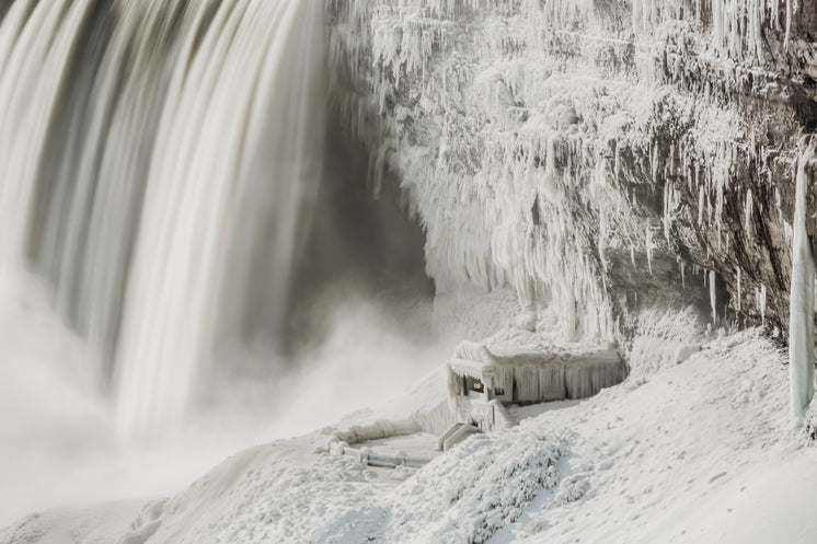 阳光明媚的瀑布和冰雪覆盖的树枝