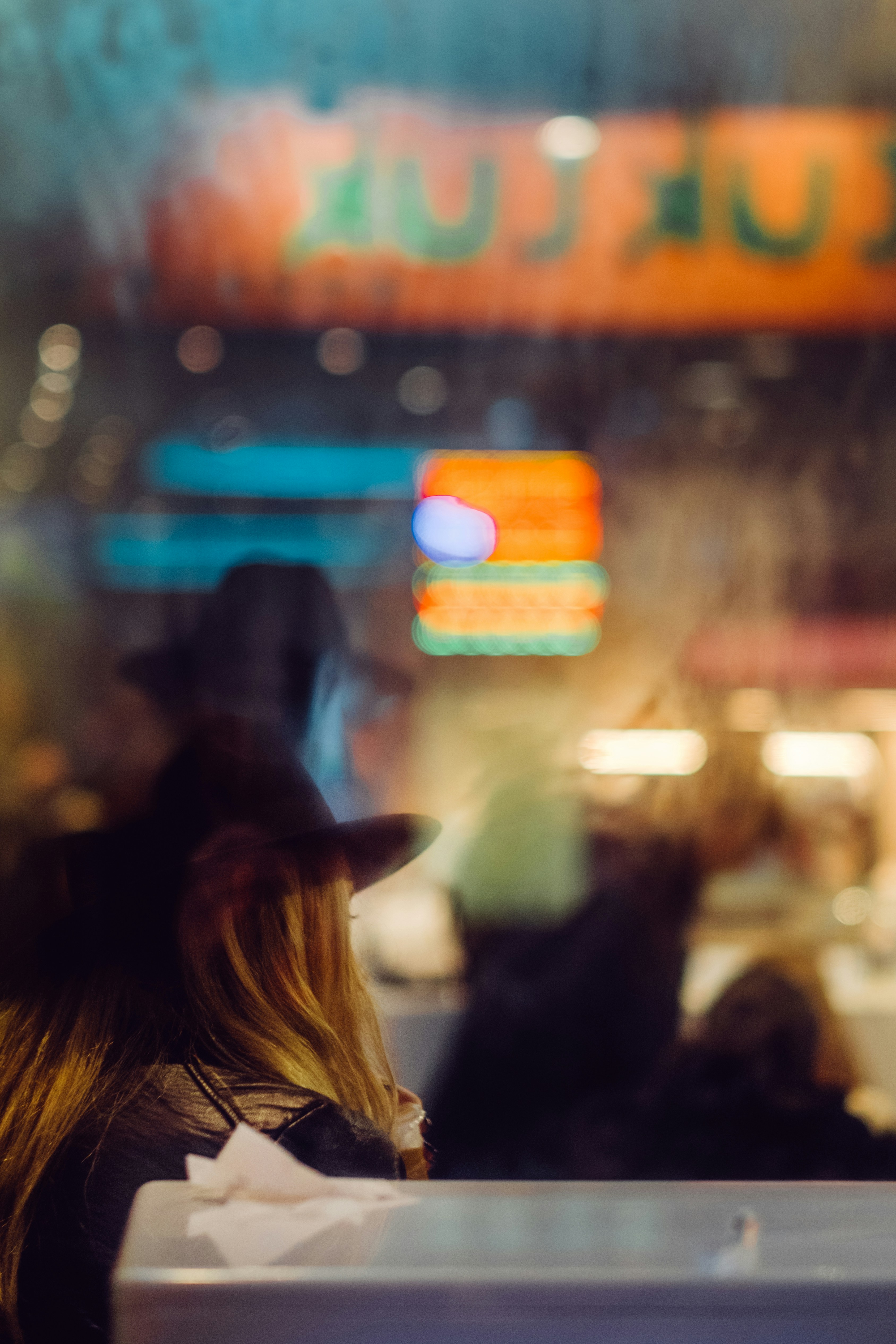 window,woman,hat,cafe,city,night,orange,bokeh,person,light,cinematic,mood,water,outdoor,outside,inside,vivid,abstraction,two person,joshua k. jackson