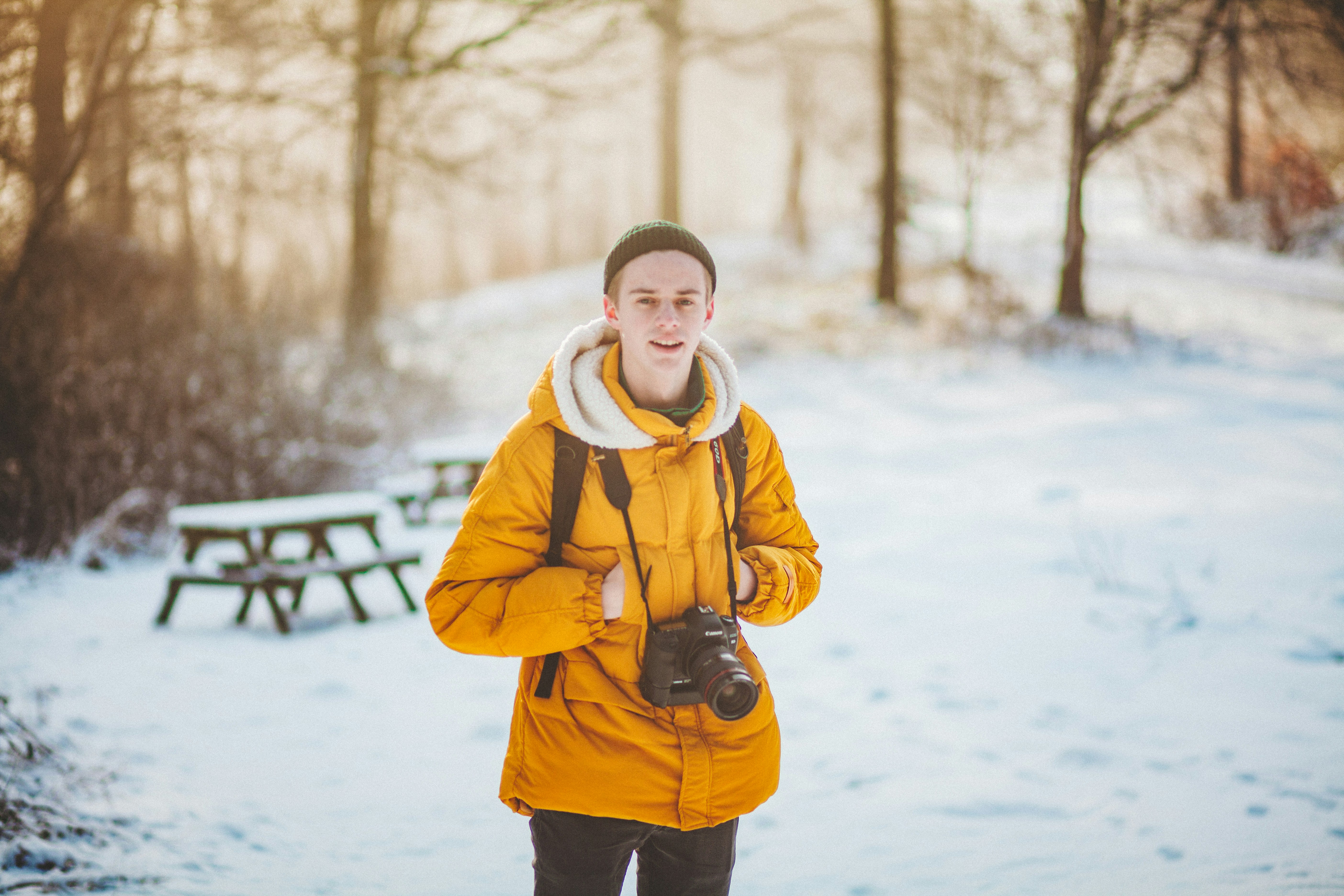 男人,男人,树木,林地,森林,公园,雪,冬天,黄色,外套,照相机,摄影师,肖像,山,松树,探险家,木头,探险家,旅行家,旅游