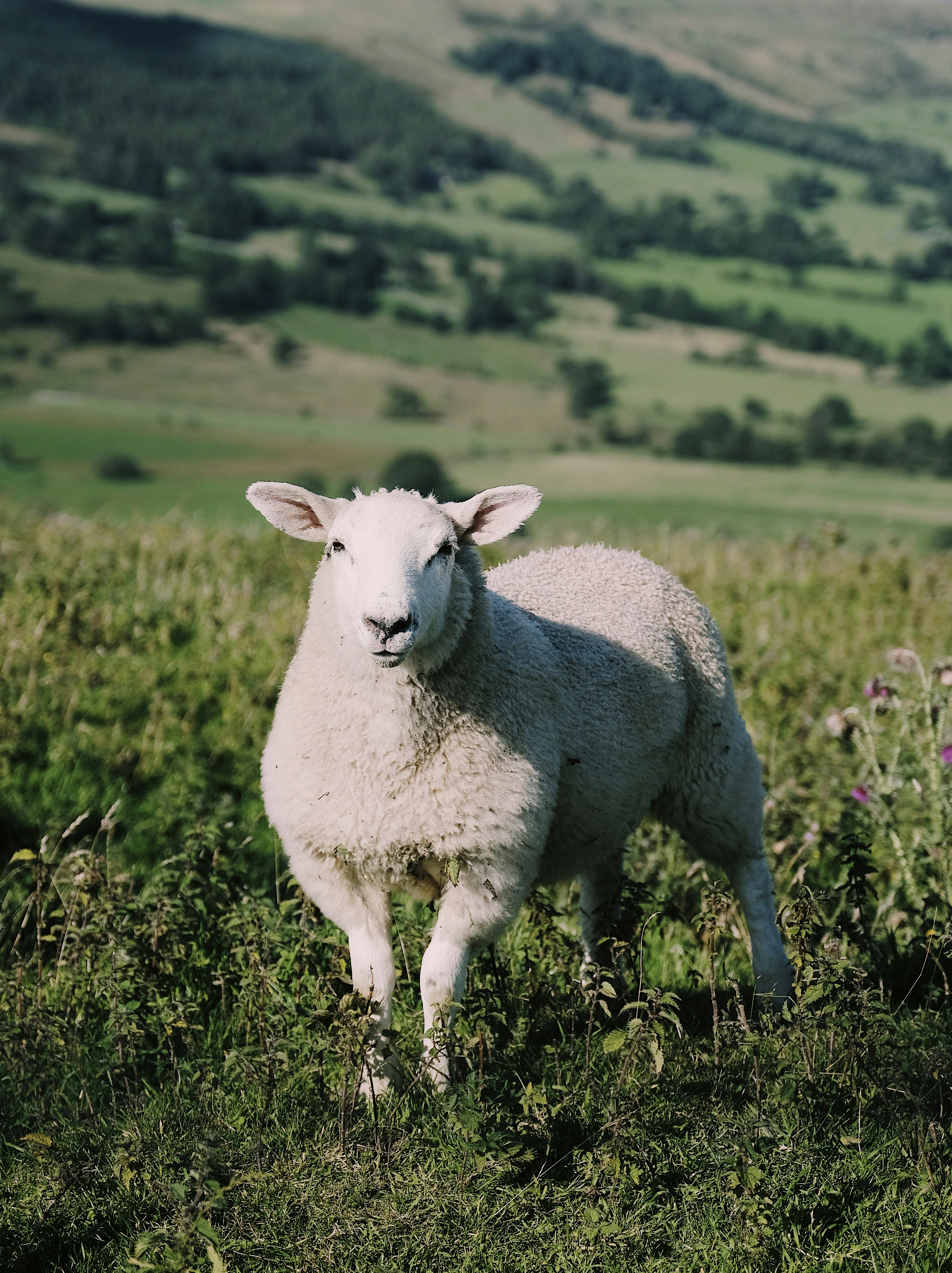 一只白羊摆在一片杂草丛生的田野中间,俯瞰着树木丛生的丘陵牧场。