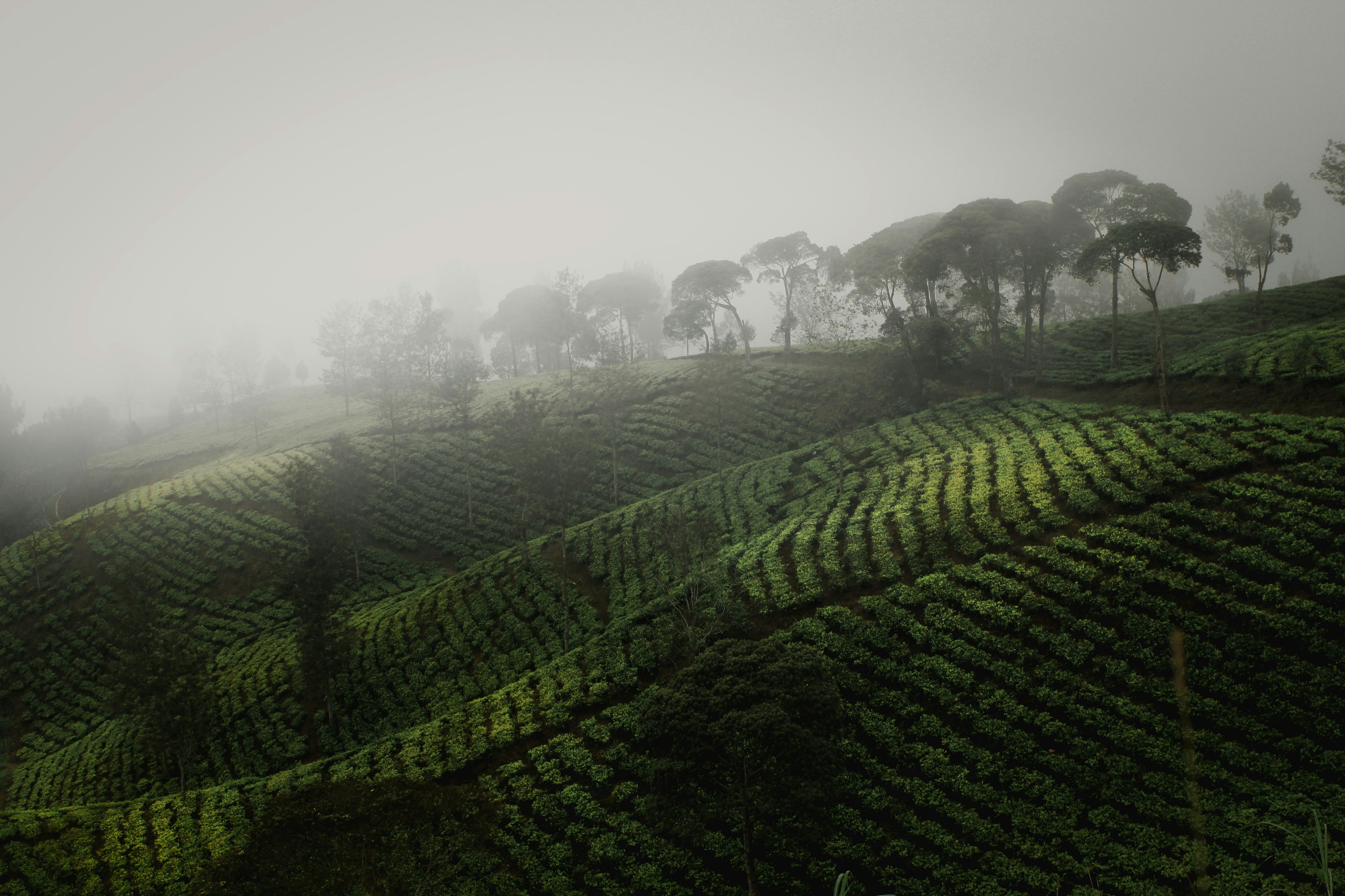 景观、田地、树木、林地、丘陵、庄稼、自然、雾、绿、植物、茶、茶园