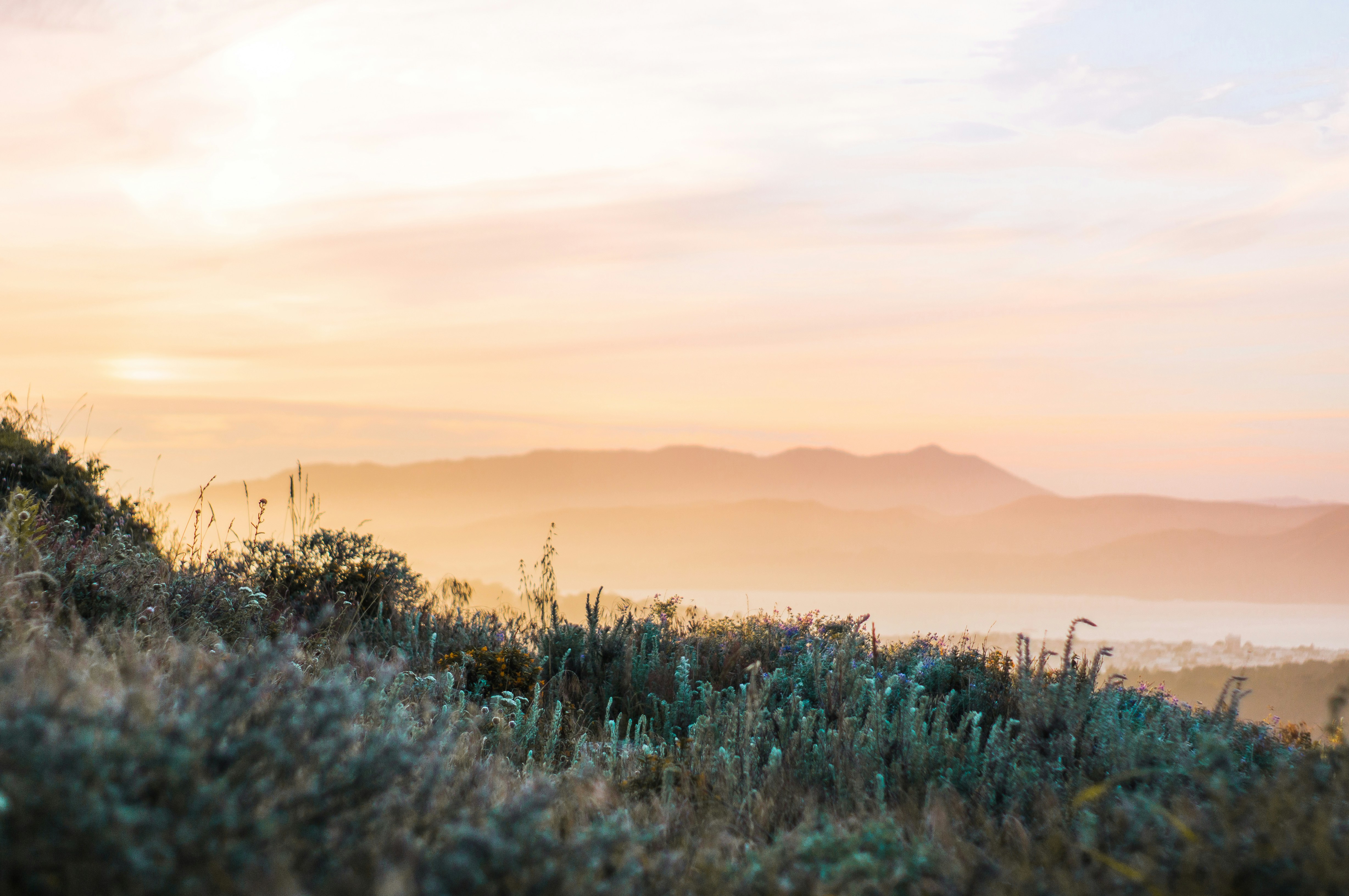 Grassy knoll with a mountain range in the horizon during a cloudy sunset in San Francisco's Sunset District neighborhood