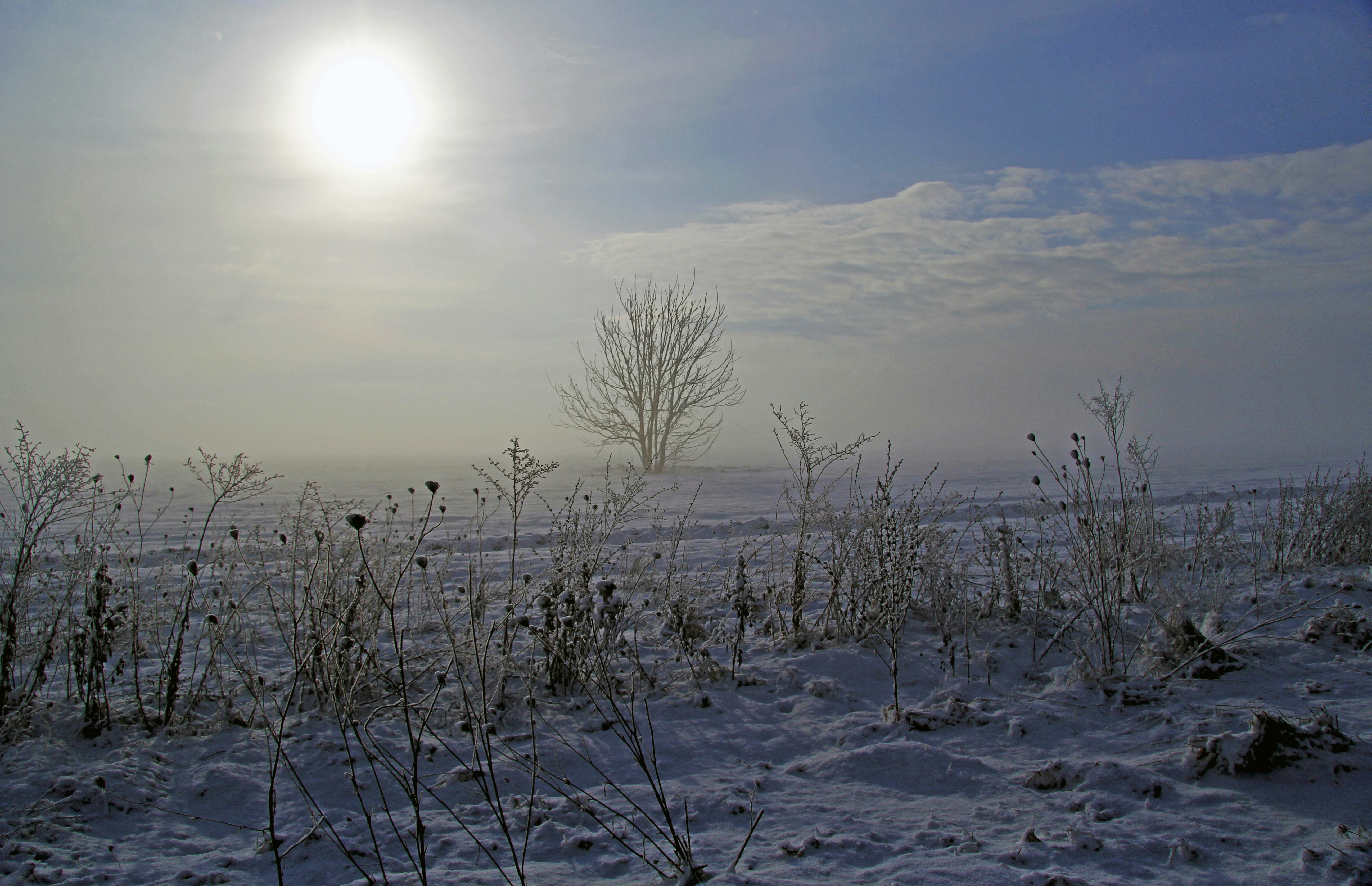Tall wild grasses and a distant leafless tree under a pale sun on a freezing winter's day