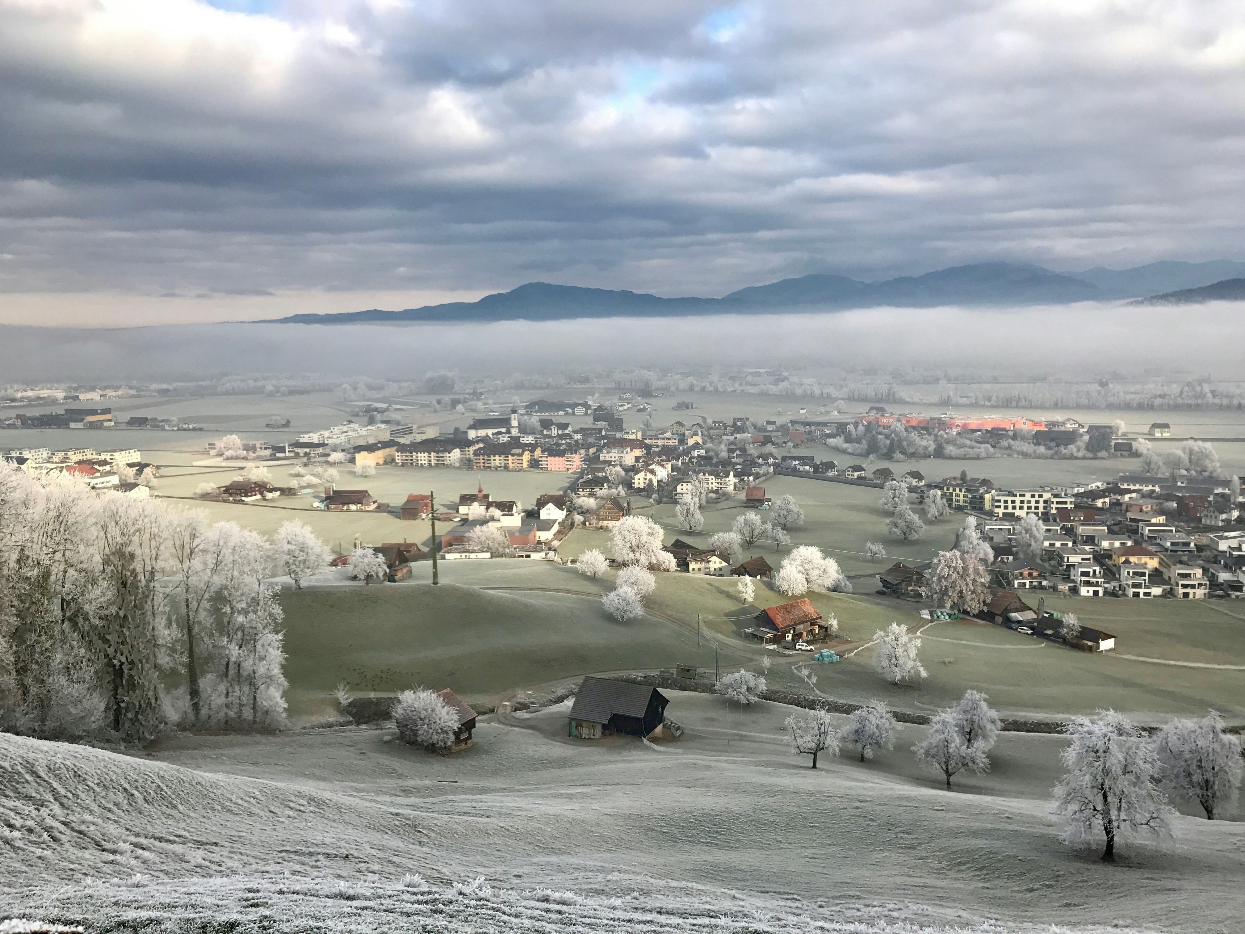山,云,树,谷仓,房子,建筑,冬天,寒冷,霜冻,田野,小屋,地平线,自然,户外,阿尔卑斯,瑞士,城镇,雾,乡村