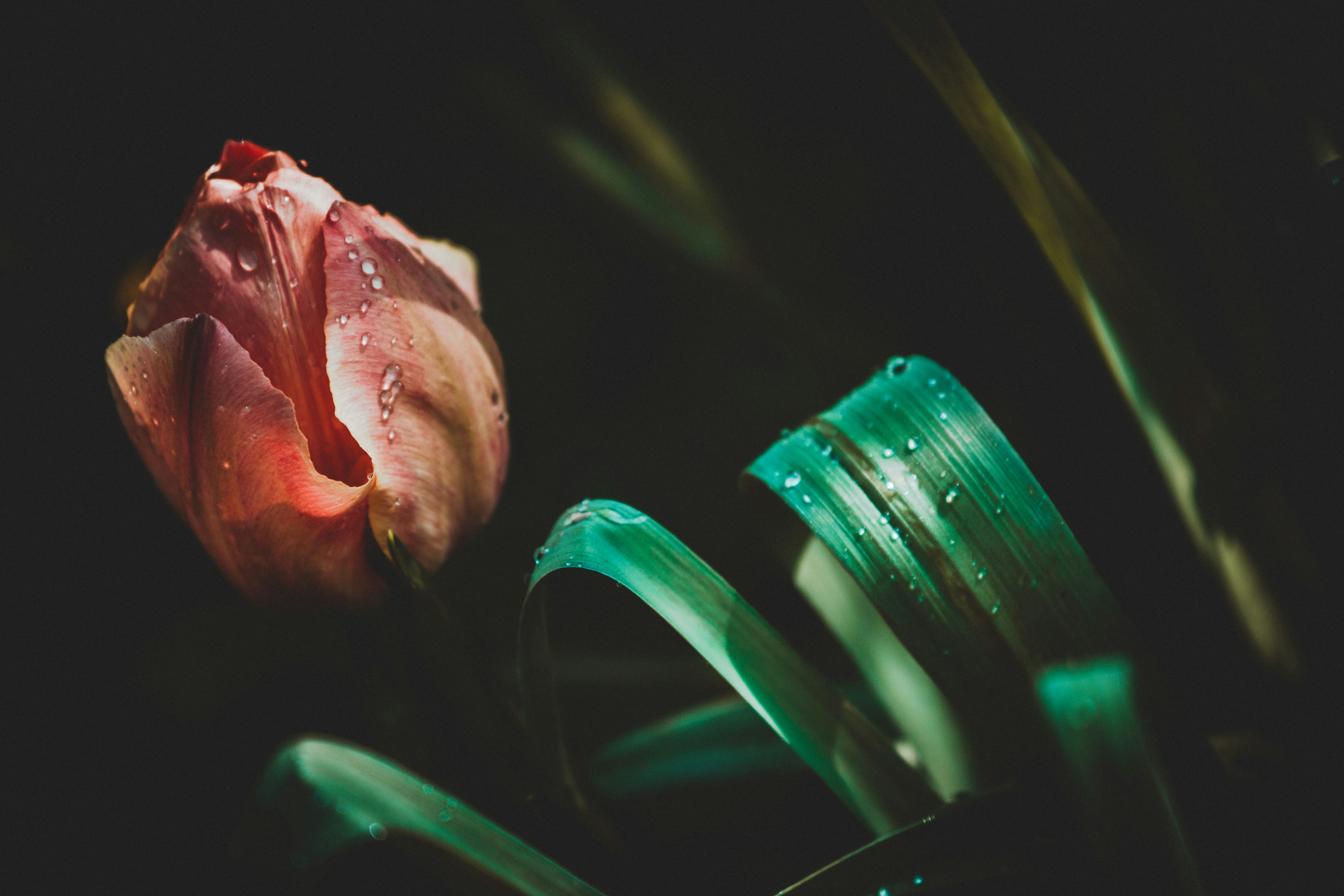 花,花,叶,叶,郁金香,水滴,雨,花瓣,粉红色,绿色,深色,特写,细节,宏观,植物,背景,壁纸,鲑鱼,花蕾,叶子