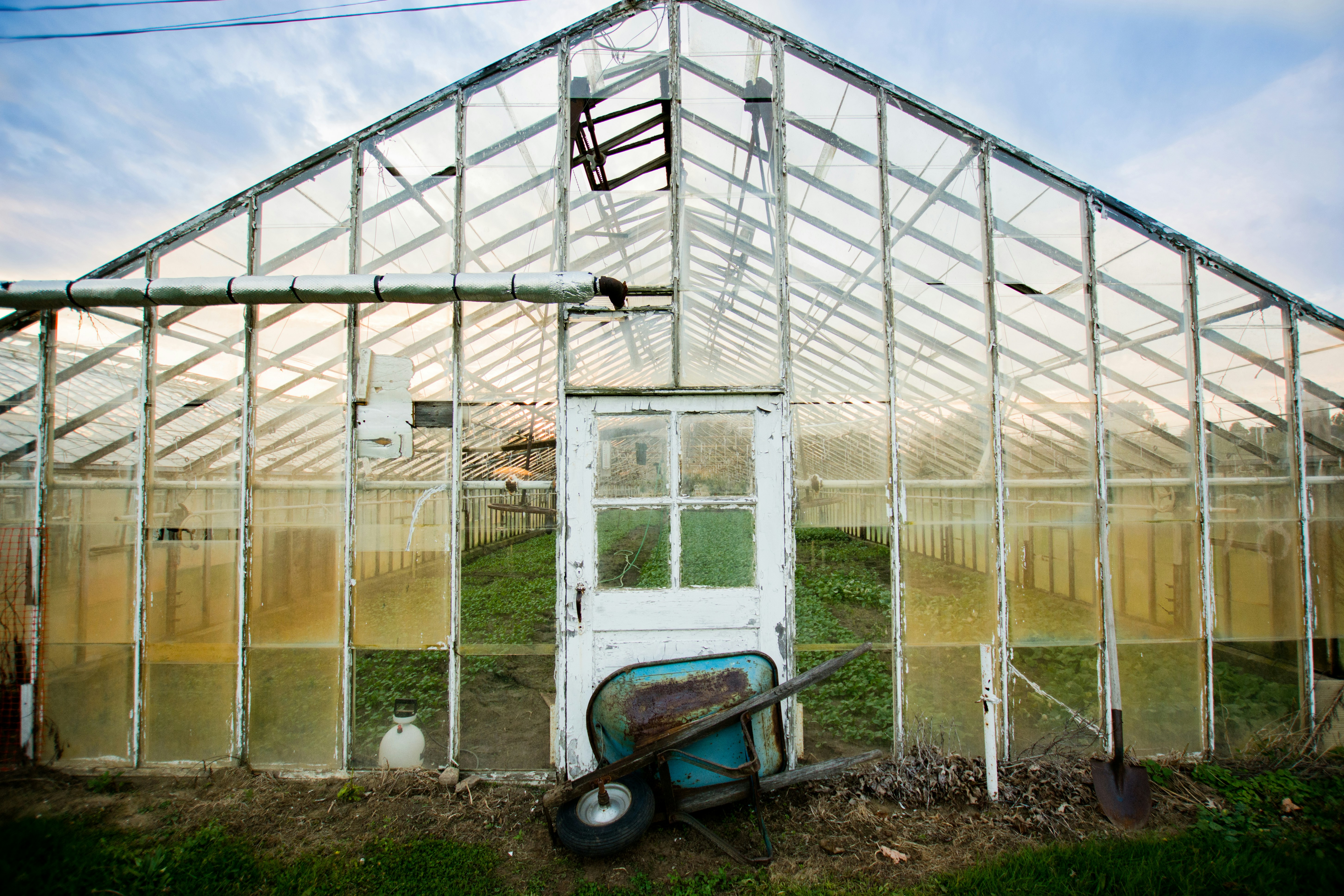 温室,门,白,旧,碎玻璃,玻璃,白门,蓝色,手推车,植物,天空,破碎,古董,绿色房子