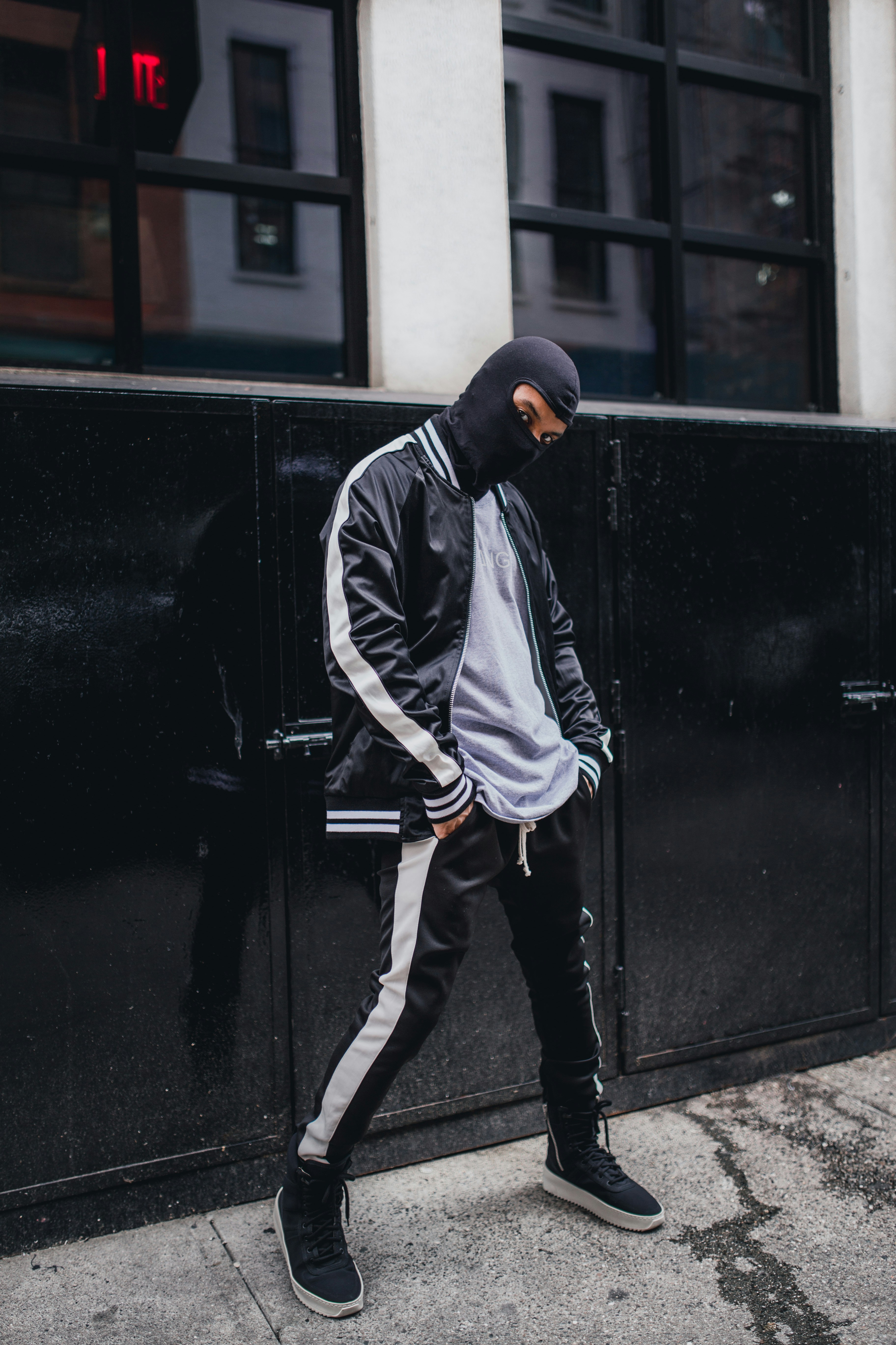 一个身穿黑色田径服戴面具的男子站在一栋黑白大楼前。