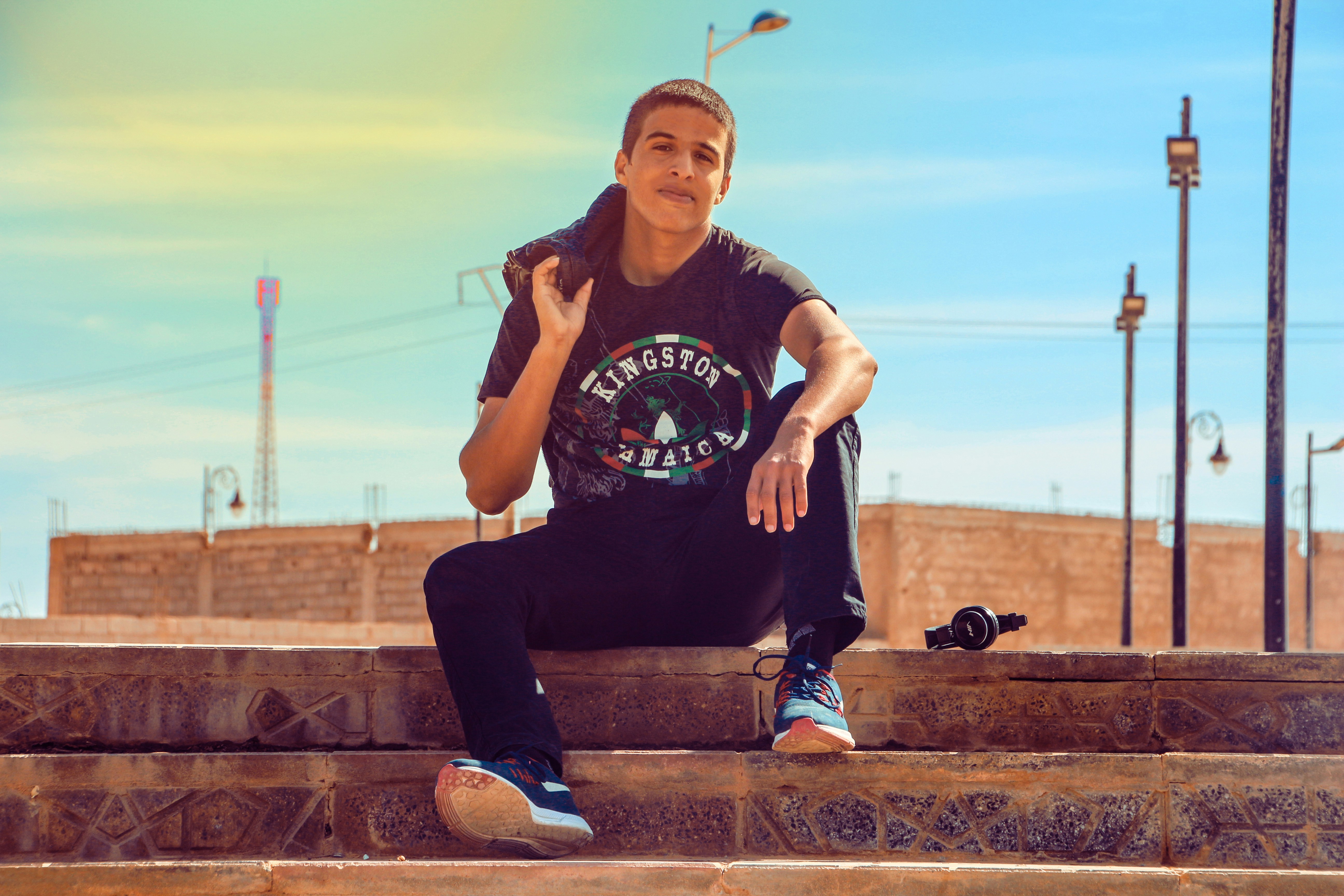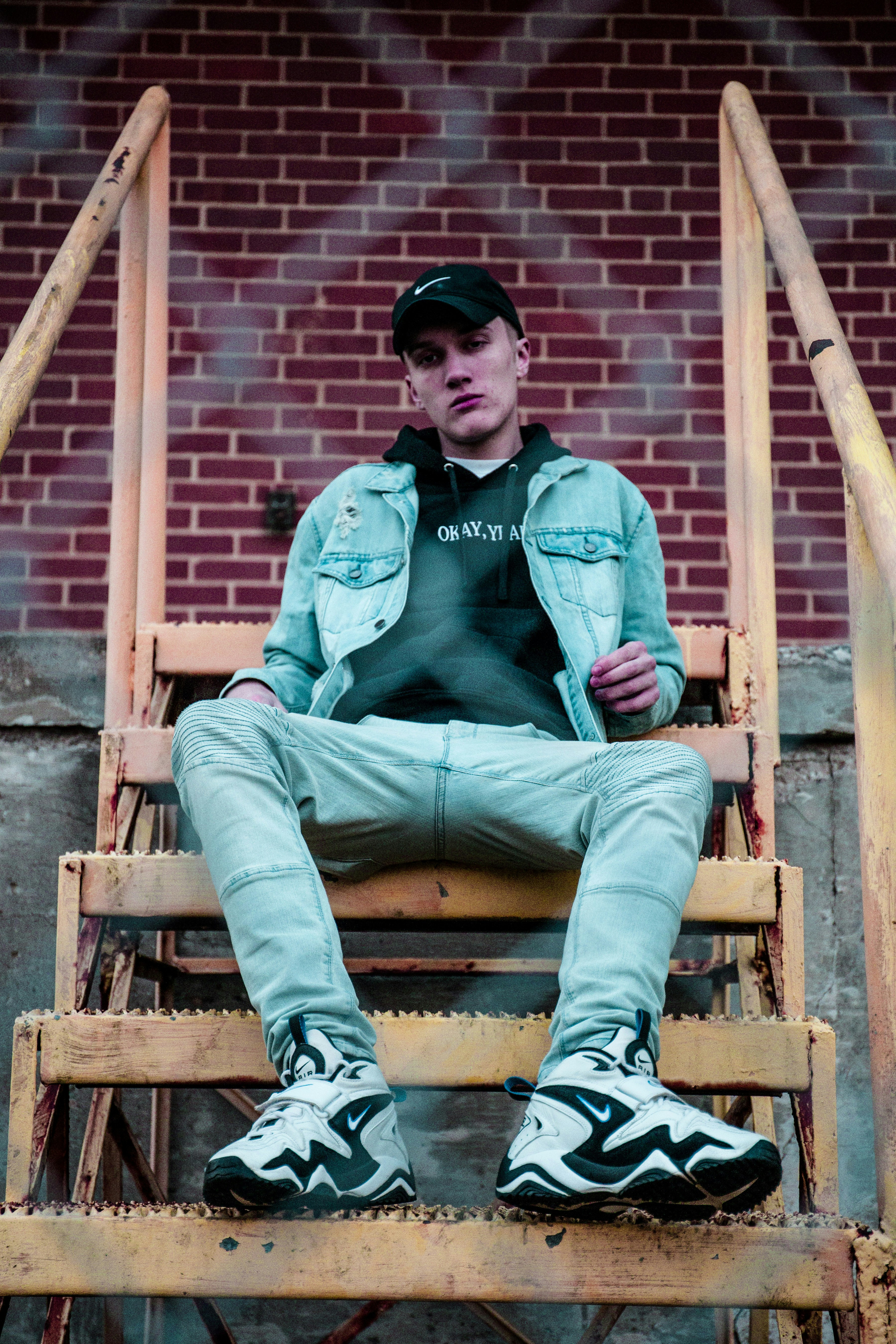 男模特,姿态,城市,夹克,帽衫,男,模特,黄色,砖头,蓝色,楼梯,男人,男孩,都市时尚,街头时尚,佳能